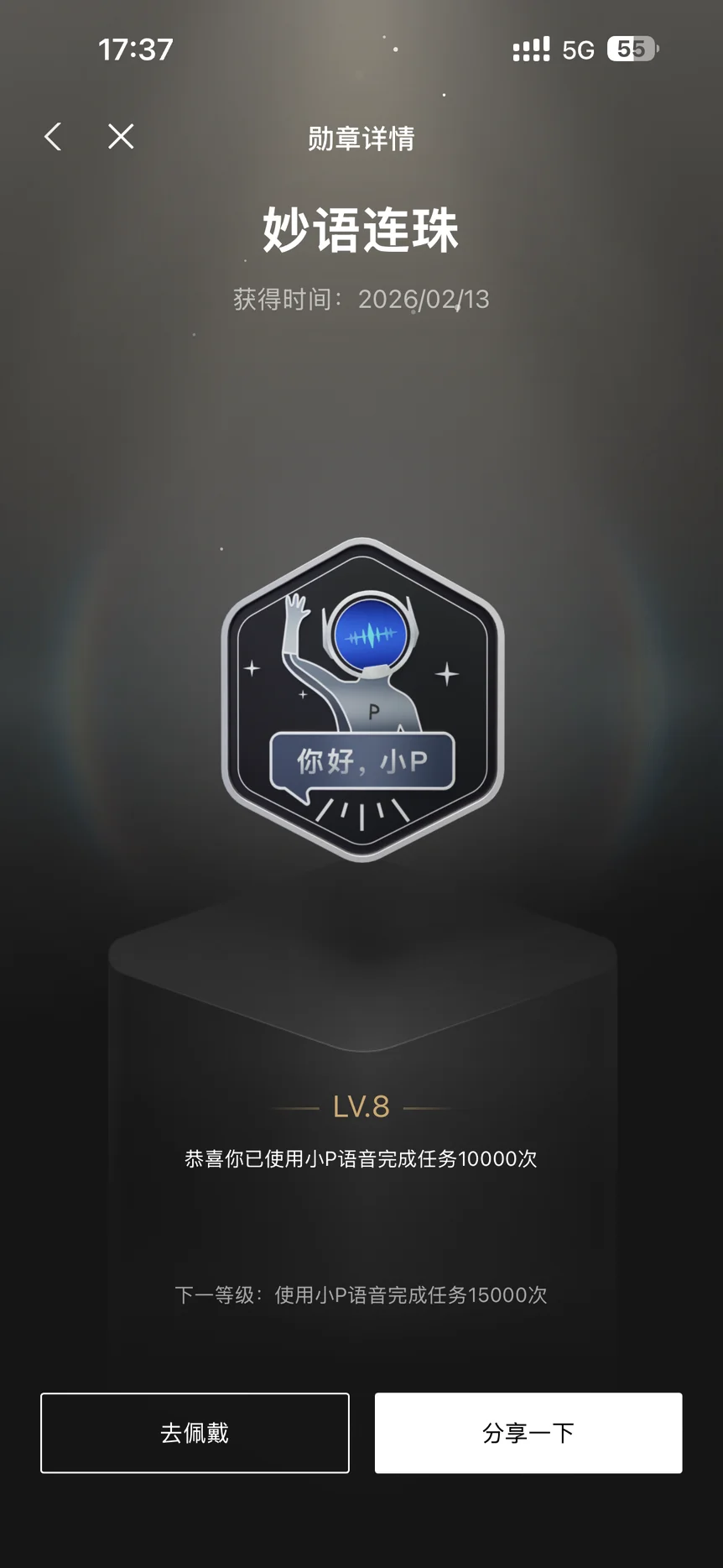 • 核心用户的王冠:10,000 次语音交互达到 LV.8,这个勋章极其罕见!它是真正的“深度用户鉴别器”。它证明我早已习惯了用声音控制车辆,小 P 已经完全融入了我的用车生活。这个 LV.8 在社区里晒出来,绝对是大神级别。