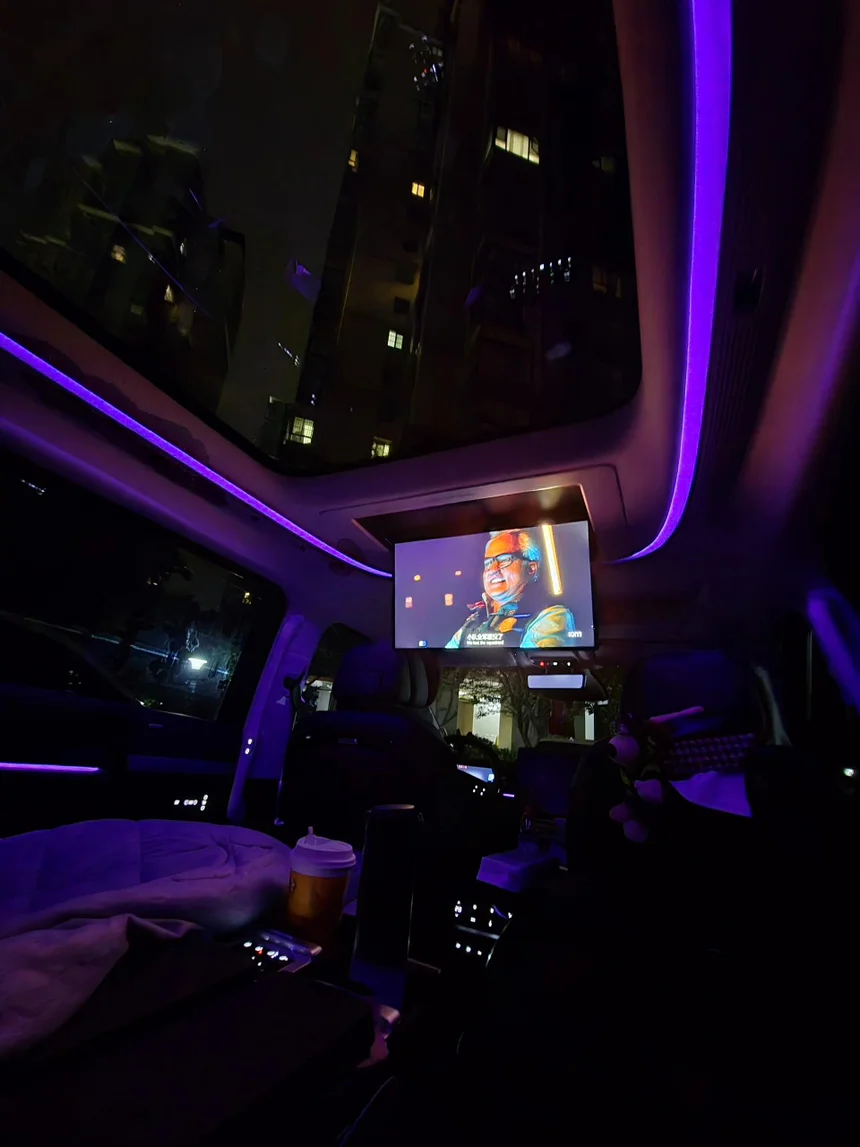夜幕降临,天窗外是城市的霓虹和高楼,而我的 X9 内,是属于我一个人的紫色电影时刻。调亮氛围灯,打开吸顶屏,喝一口最爱的饮料。这一刻,我不需要扮演任何角色,不需要理会工作和烦恼,我只是一个安静的看客。这种极致的放松,就是生活中最治愈的瞬间。