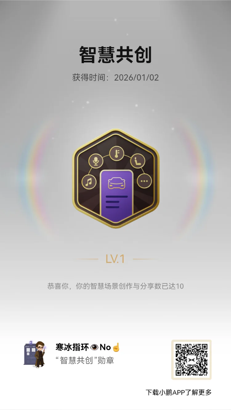 什么叫勋章😲?狭义来说勋章是授予个人的一种荣誉标志。但是今天咱们这个勋章,应该是双向的一种信任与肯定。没有小鹏汽车的三电优化技术,优秀的辅助驾驶,丰富多彩的社区活动,哪里来的我的勋章。