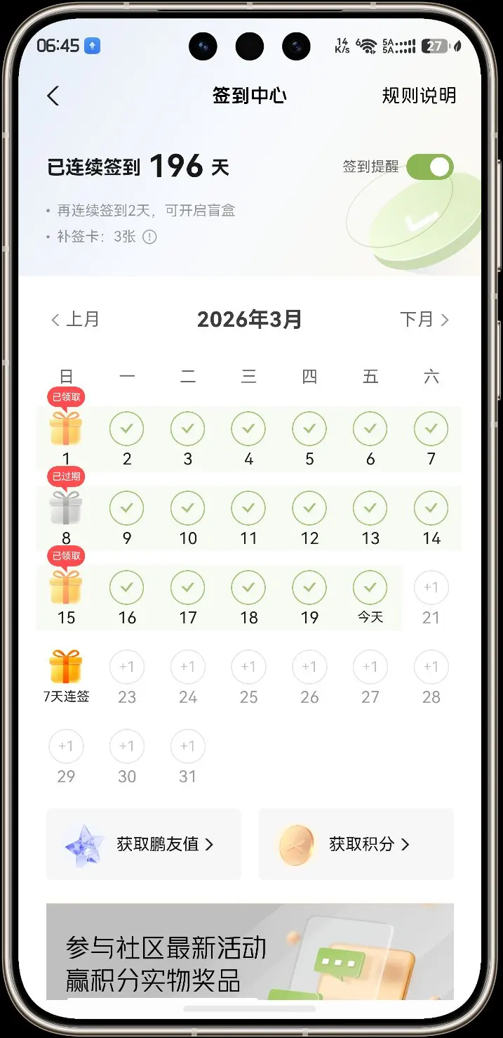 签到,是种美得,因为签到的时候必然关注其他咨询,关注其他文章,小鹏APP不仅是车控软件,更是获取第一首鹏厂咨询,与很多志同道合人交流的平台。