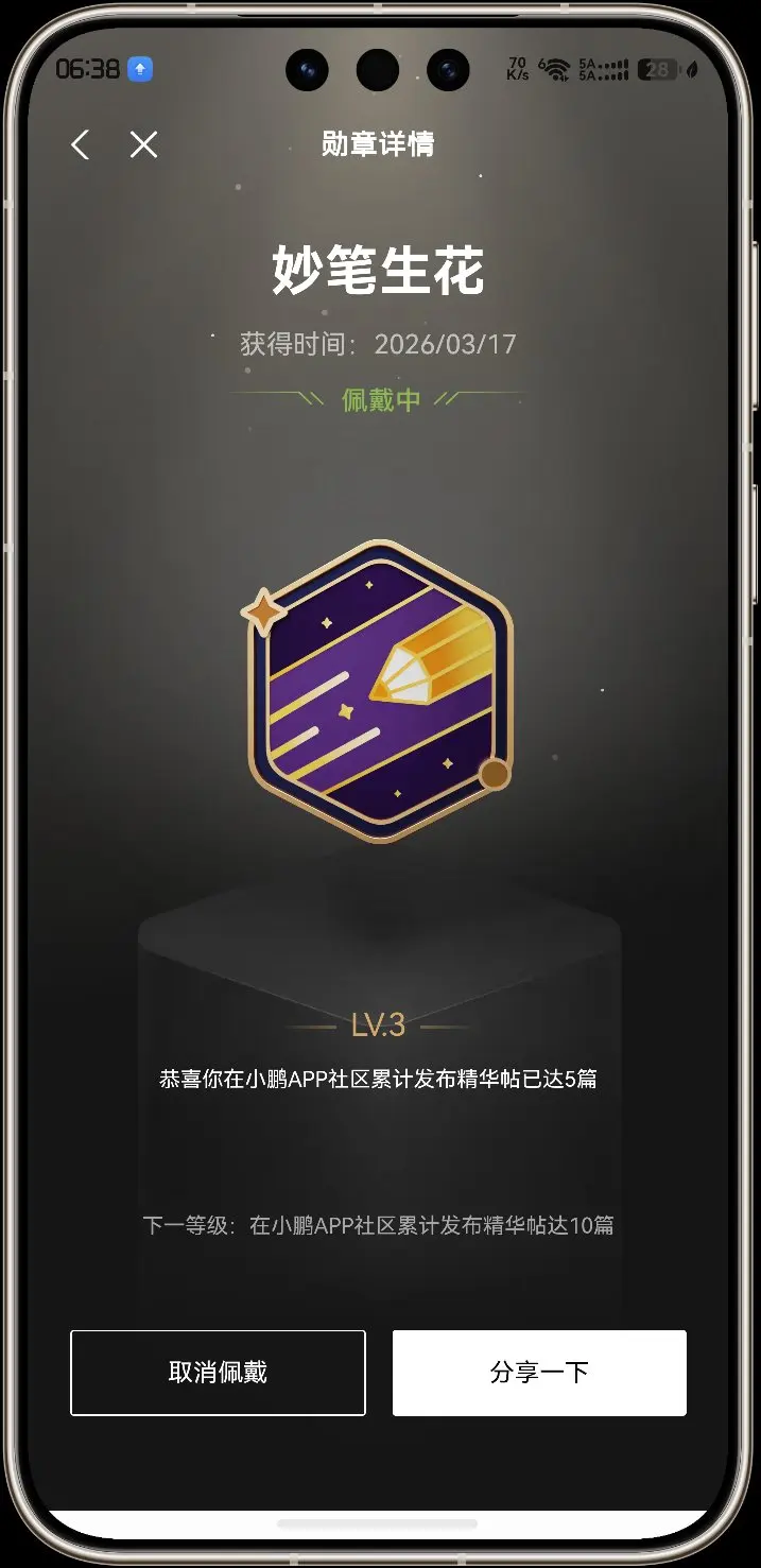 所以呢,妙笔生花的这个勋章是我佩戴的,它是小鹏汽车三电,智驾,社区活动,家庭出行等,综合出来的结晶。再次感谢运营者们。