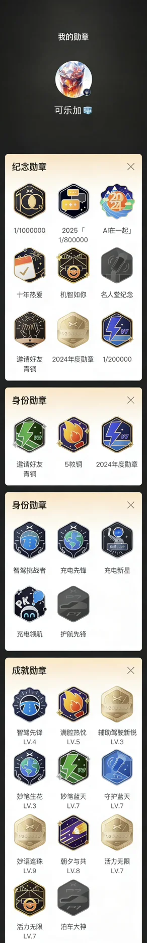从1/1000000到1/200000的限量纪念章,再到十年热爱与2024/2025年度勋章,每一枚都藏着专属记忆:
