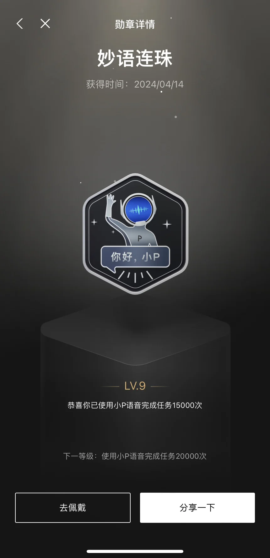 妙语连珠 :2024年4月解锁的这枚勋章如今已经升到LV.9,见证了我用小P完成的15000次语音任务,说真的这完全是日常用车堆出来的习惯,上车先喊“你好小P”,导航、点歌、调空调全靠它,就连堵车无聊时也会跟它唠两句,现在没它搭腔反而觉得开车少了点烟火气。