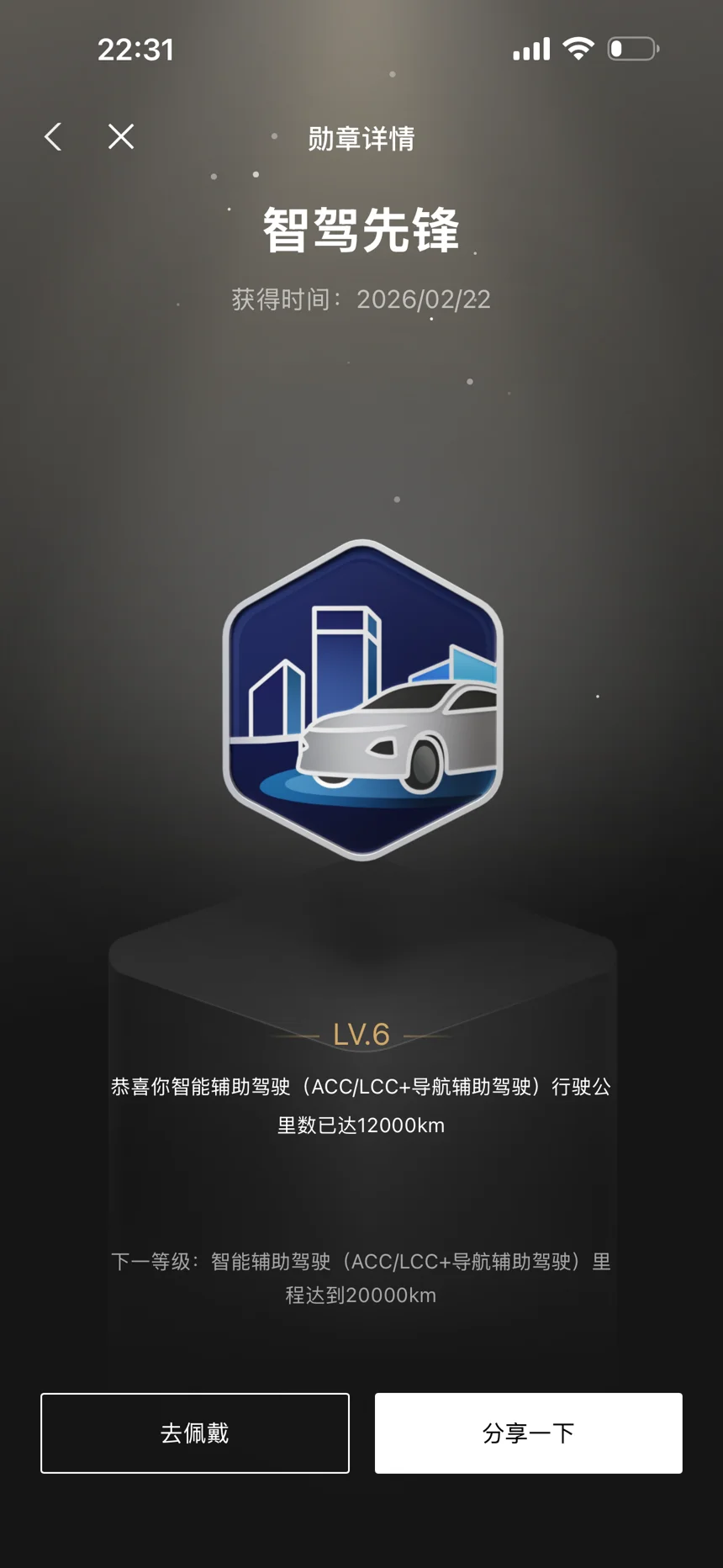 看着小鹏App里那熠熠生辉的勋章,仿佛翻开了一本专属的出行成长册。「智驾先锋」LV.6,记录着12000km智能辅助驾驶的探索——ACC的从容跟车、LCC的车道坚守、导航辅助的全局规划,每一次智驾场景的应对,都是科技与驾驶默契的进阶;「朝夕与共」LV.6,400次签到的坚持,是日复一日对小鹏的关注与陪伴,像老友间的默契打卡,把品牌融入日常;「充电先锋V2」,200度电的充能里程碑,见证了每一次补能的安心,也解锁了专属会员权益。这些勋章不仅是数字与等级,更是我与小鹏双向奔赴的见证:它在智驾领域持续突破,带我探索出行新可能;我以里程、签到、充能回应,成为品牌成长的参与者。未来,期待带着这些勋章赋予的底气,和小鹏一起驶向更多12000km、600次签到、更高充能的精彩节点,让智能出行的故事,在勋章的见证下不断续写。