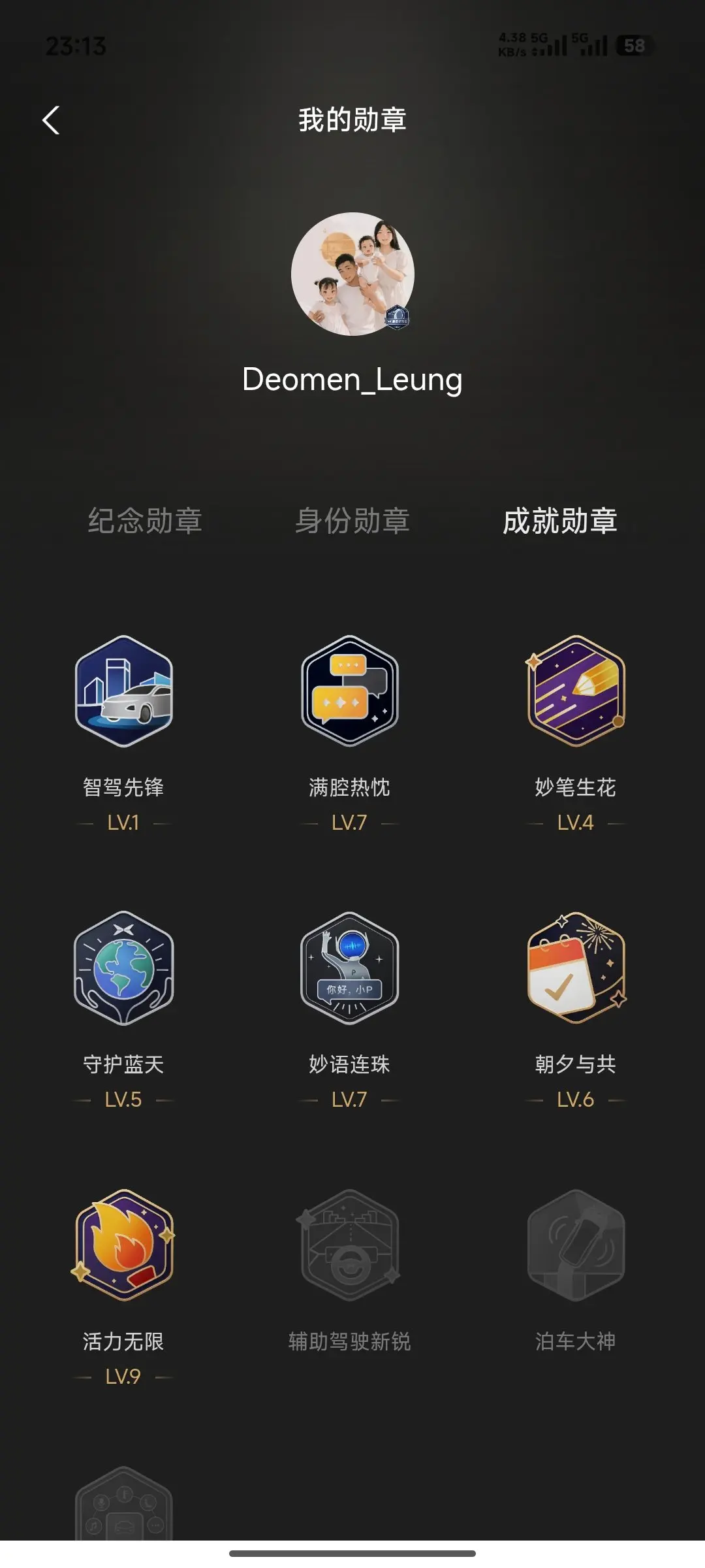 智驾先锋LV.1、满腔热忱LV.7、妙笔生花LV.4、守护蓝天LV.5、妙语连珠LV.7、朝夕与共LV.6、活力无限LV.9