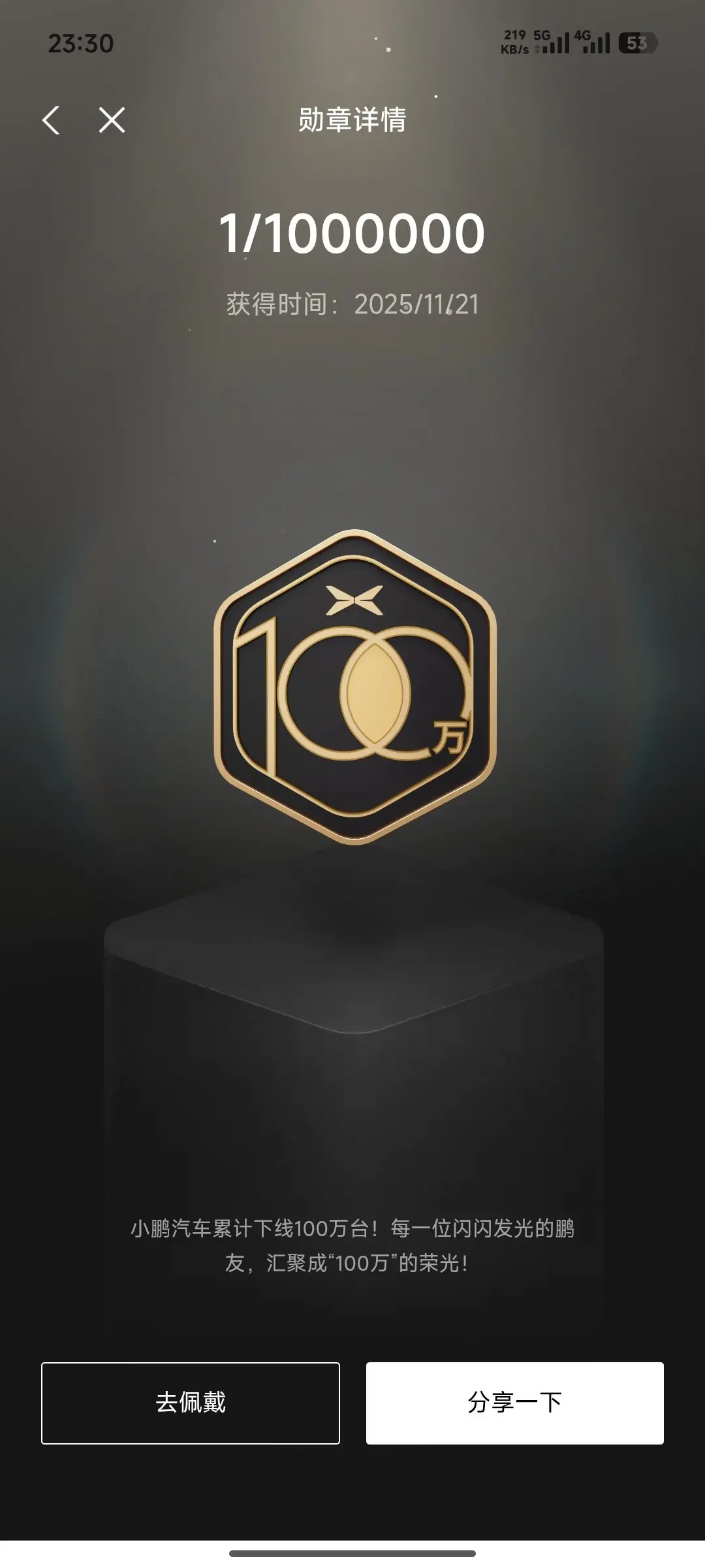 这类勋章是小鹏品牌发展和我个人陪伴的见证,尤其是「1/1000000」和「十年热爱」,一个代表着千万用户的里程碑,一个是我十年陪伴的印记,每次晃动它们都像在和时光打招呼。