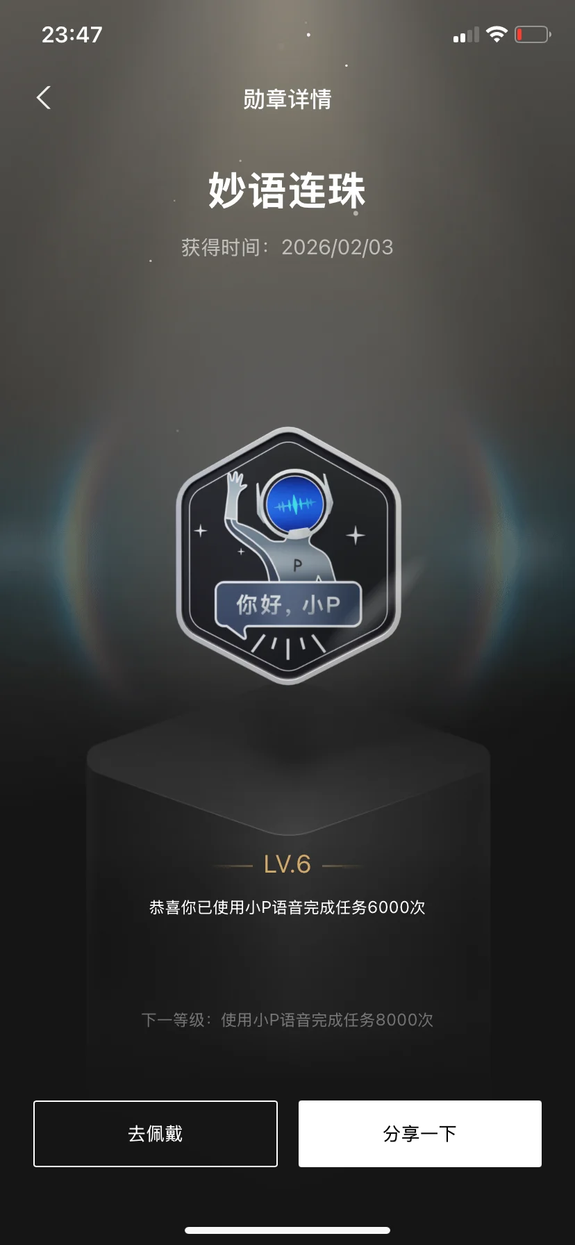 「妙语连珠」LV.6的达成,是6000次和小P的默契互动,更多的是家里小朋友和小P有趣的聊天;