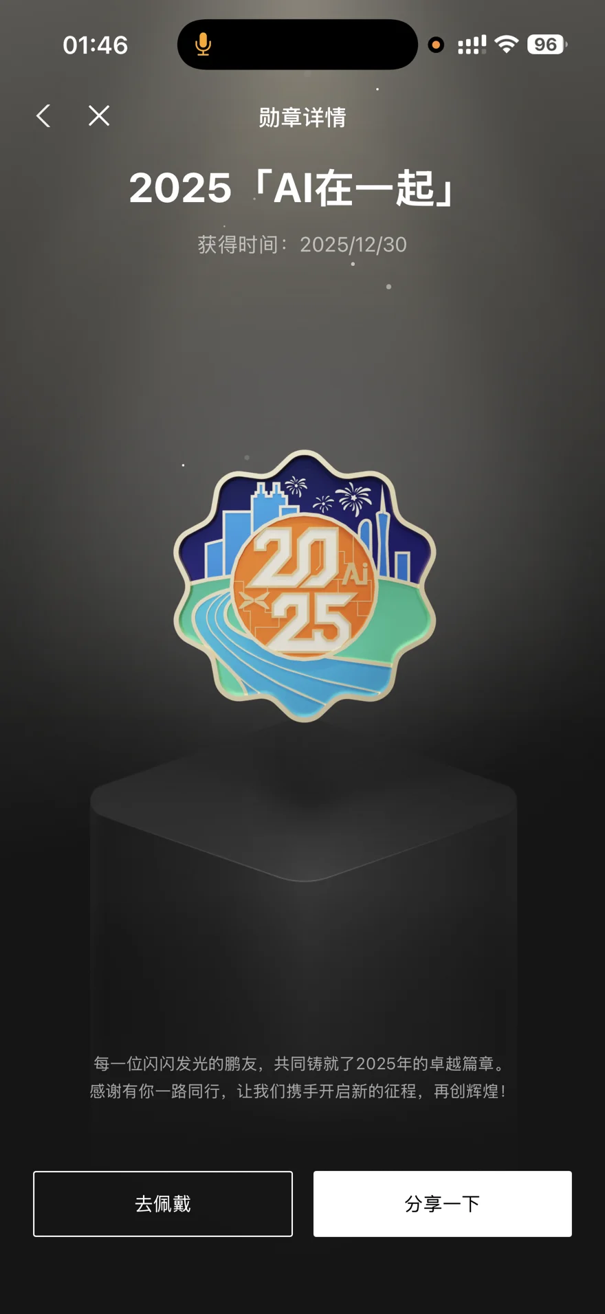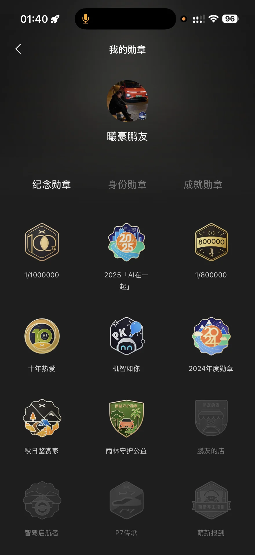 纪念勋章里,「十年热爱」见证着我与小鹏的双向奔赴,「2024年度勋章」「2025「AI在一起」」记录着每一个并肩前行的日子,还有「秋日鉴赏家」「雨林守护公益」这些带着温度的限定款,每一枚都藏着一段特别的回忆。