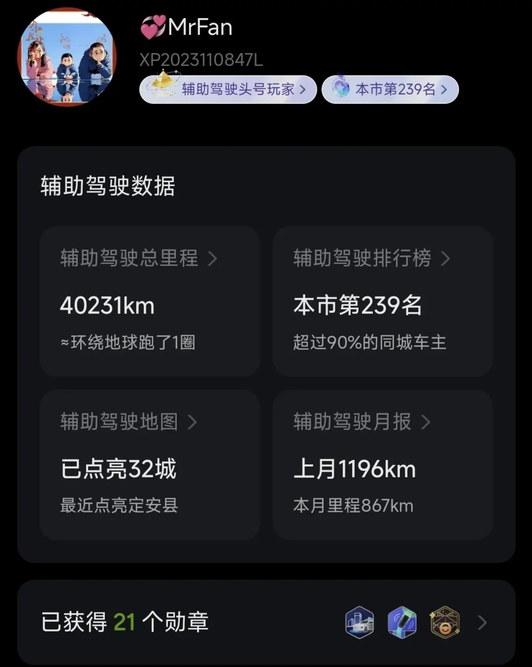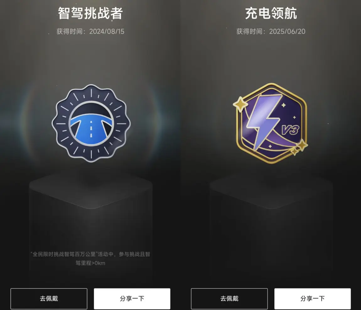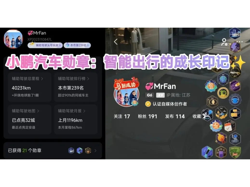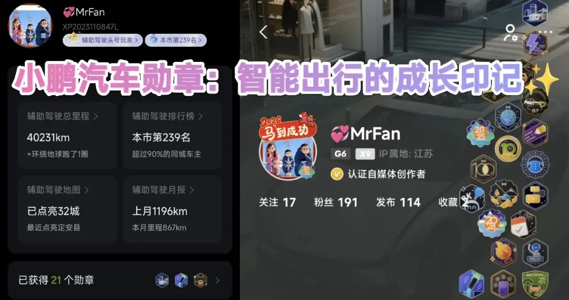 身份勋章承载着对智驾科技的探索热情,同时记录着电动补能的成长轨迹,共同勾勒出与小鹏智能出行深度绑定的用车日常。