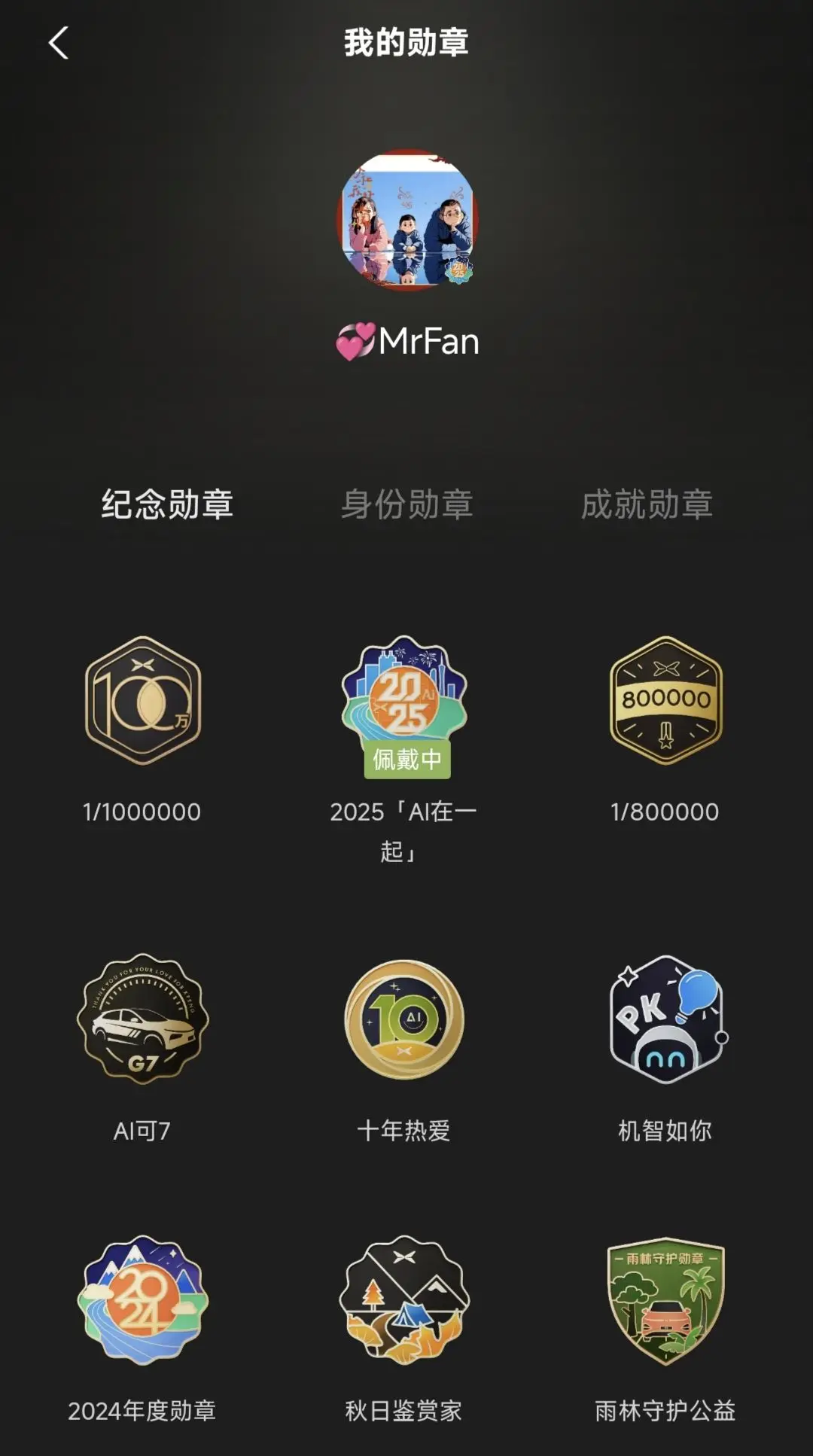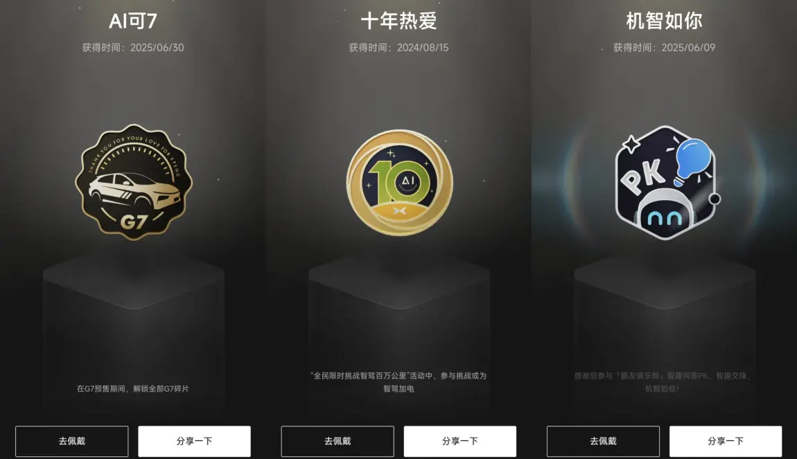 「AI可7」是G7车主的专属印记,在预售期间解锁全部G7碎片,藏着对这款智能座驾的偏爱与期待,是身份与热爱的双重象征。「十年热爱」是与小鹏品牌相伴十年的见证,在智驾挑战活动中并肩同行,标记着长久陪伴的深厚情谊,是十年如一日信赖的最好证明。「机智如你」则是鹏友俱乐部智趣问答PK的趣味嘉奖,在知识交锋中展现智慧,让社区互动充满乐趣与挑战,是活跃参与的生动注脚。