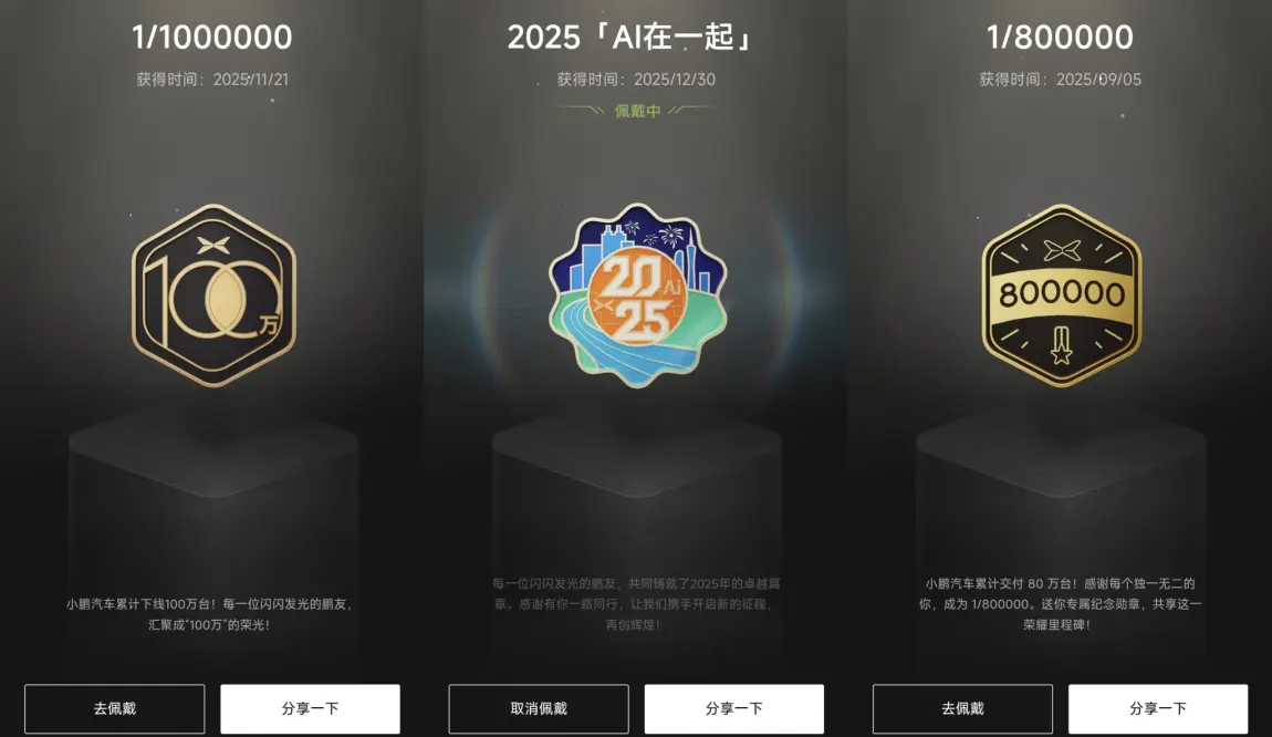 「1/1000000」与「1/800000」两枚稀有勋章,是小鹏汽车迈向百万下线、八十万交付的荣耀见证,也让你成为品牌重要里程碑里独一无二的一员,每一枚都镌刻着与品牌共成长的骄傲。「2025「AI在一起」」正佩戴在身,作为年度专属纪念,它串联起鹏友们同行的时光,致敬每一份对智能出行的热爱,也寓意着在AI赋能的出行路上继续携手向前。
