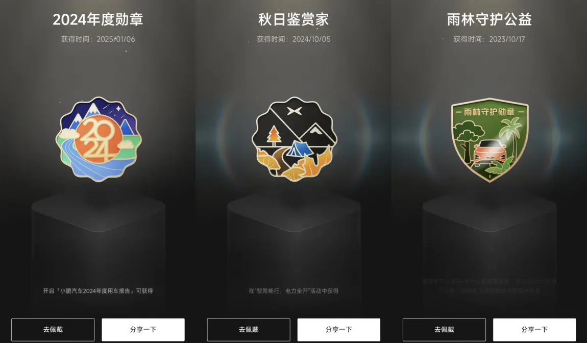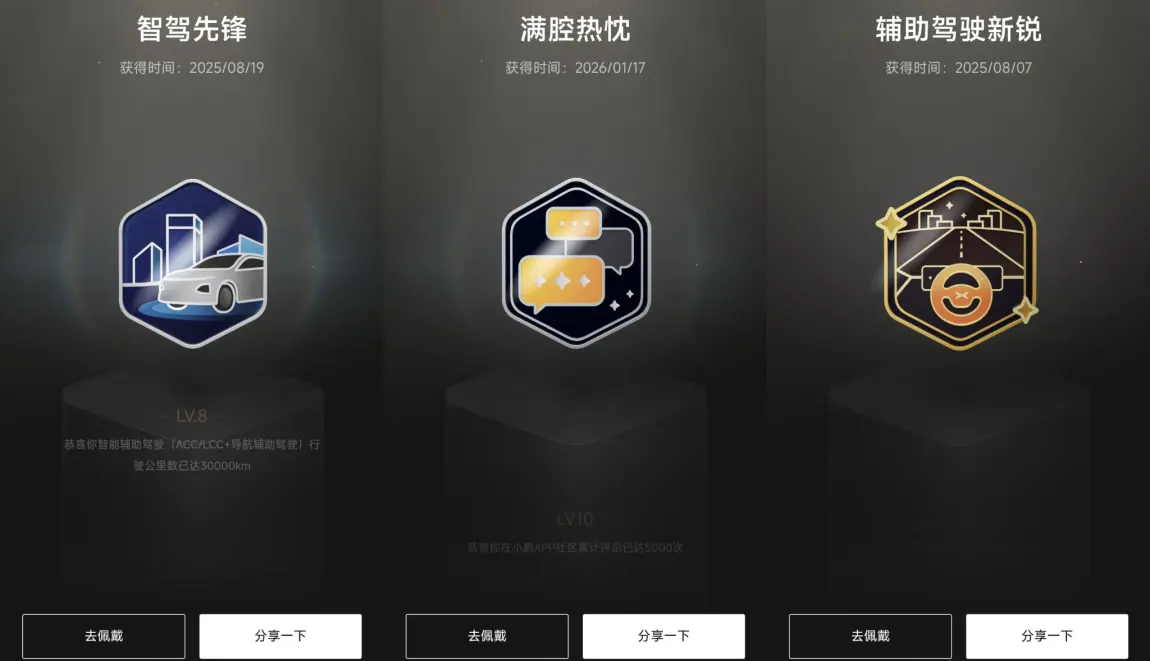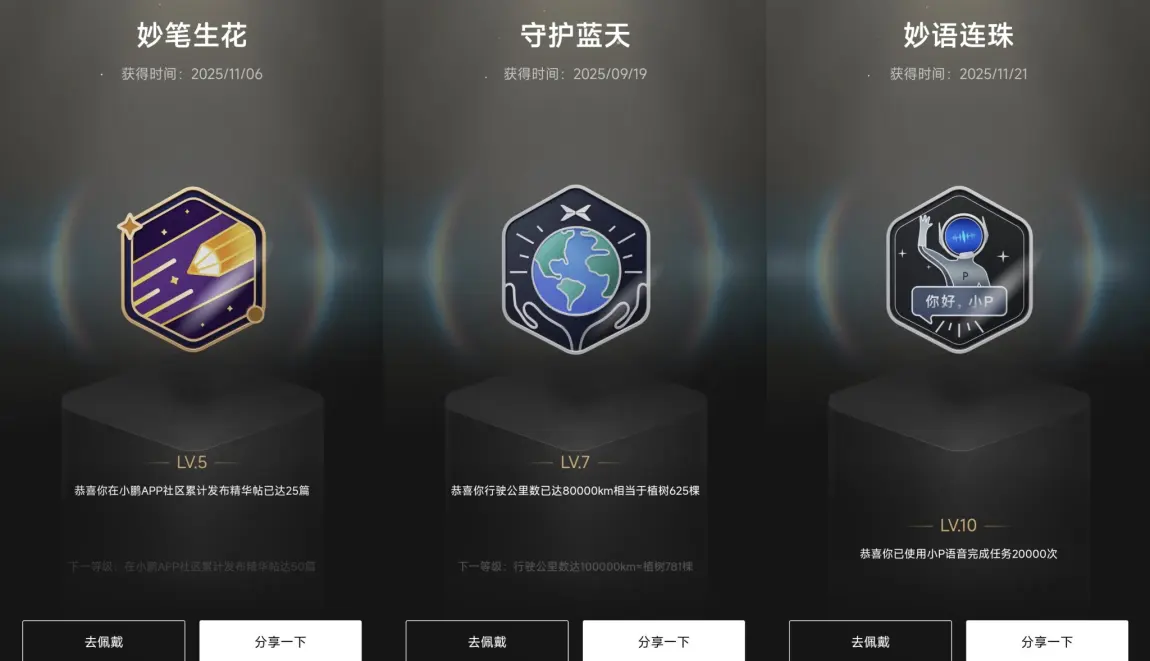 成就勋章是与小鹏智能出行深度绑定的鲜活见证,每一枚徽章都镌刻着日常用车与社区互动的点滴成长。