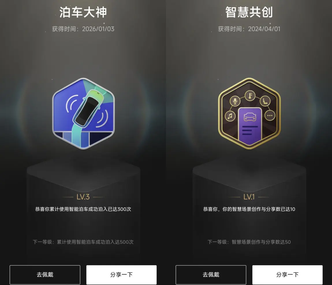 「泊车大神 LV.3」是300次智能泊车成功入位的实力见证,每一次精准入库都藏着对小鹏智驾科技的信赖,让复杂车位不再是出行难题,也向着500次的进阶目标稳步迈进。「智慧共创 LV.1」则是10个智慧场景创作与分享的起点,从自定义用车习惯到分享实用场景,用创意点亮智能出行生活,也为50个场景的共创之路埋下伏笔。
