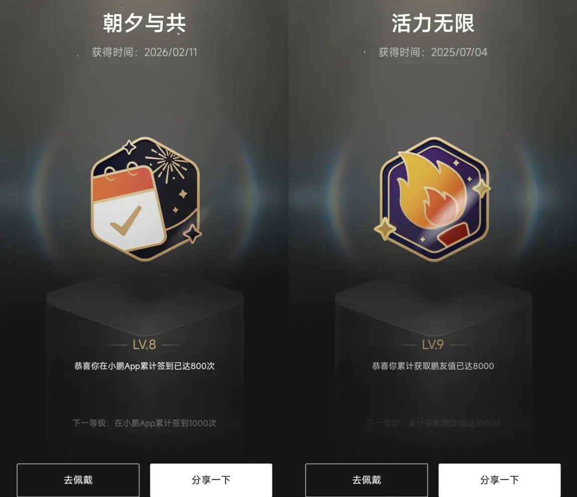 「朝夕与共 LV.8」是800天持续签到的见证,每一次打开小鹏App的点击,都化作与品牌朝夕相伴的默契,藏着对智能出行生活的日常眷恋,向着1000次的目标稳步前行。「活力无限 LV.9」则是8000鹏友值的积累,每一次社区互动、用车分享、任务完成,都凝聚成满格的生活热情,标记着在小鹏生态里持续探索的活力,也向着10000鹏友值的新高度进发。