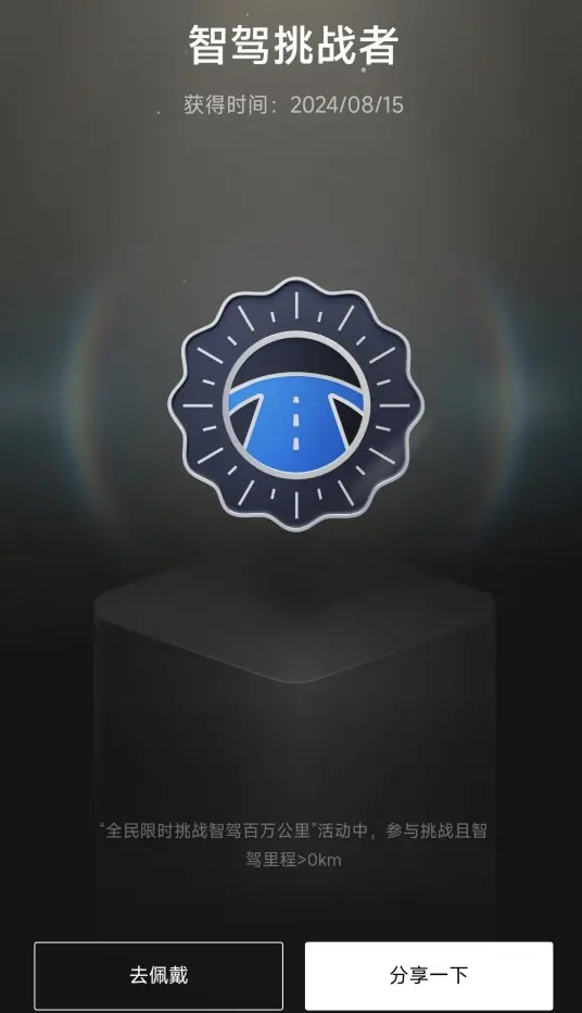 「智驾挑战者」是探索智能驾驶的勇气勋章,代表着主动体验、解锁智驾场景的探索精神,是迈向高阶智驾的第一步。