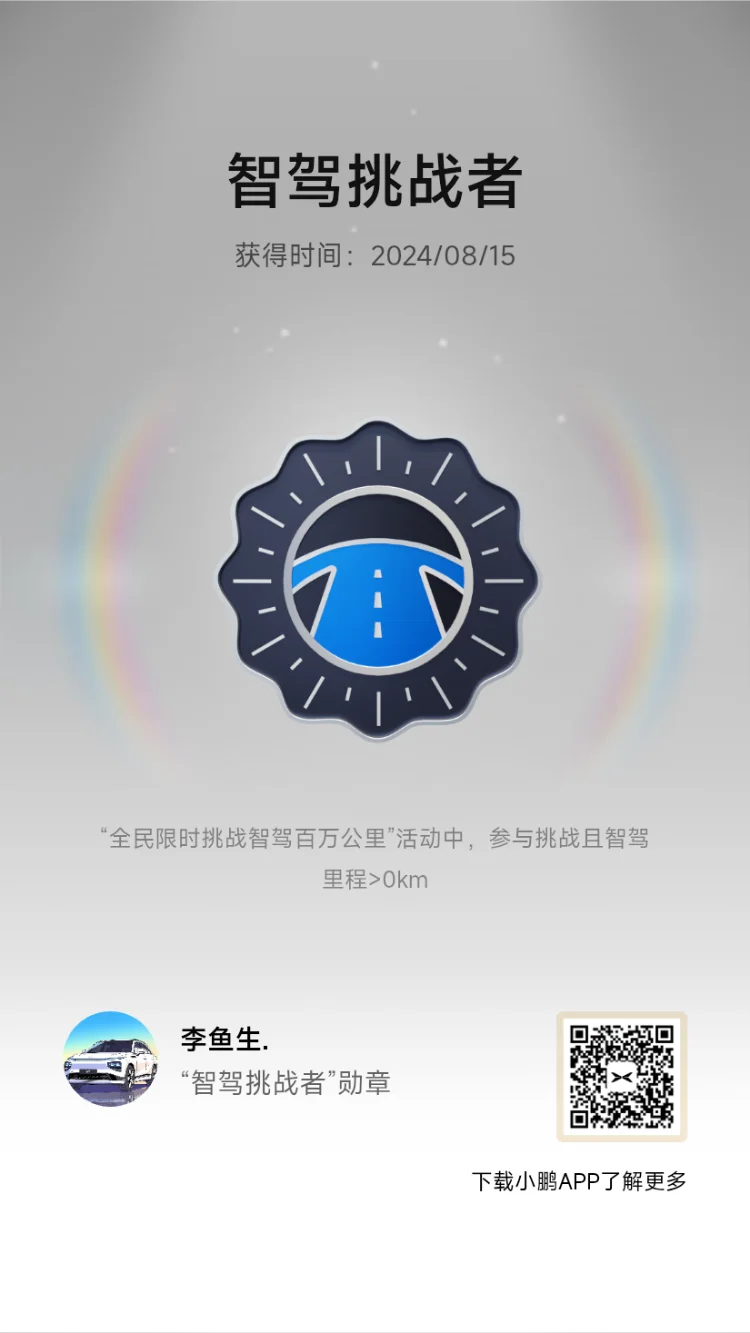 参与智驾百万公里挑战,每一次开启智驾都是一场冒险!从城市道路到高速路段,见证小鹏智驾的靠谱实力,这枚勋章是对智驾体验的最好认可~