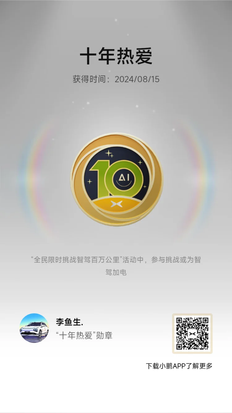 小鹏十年,有幸同行!从关注品牌到成为车主,一路见证成长与突破,这枚金灿灿的勋章,承载着对小鹏十年的认可,也藏着未来继续同行的期待❤️