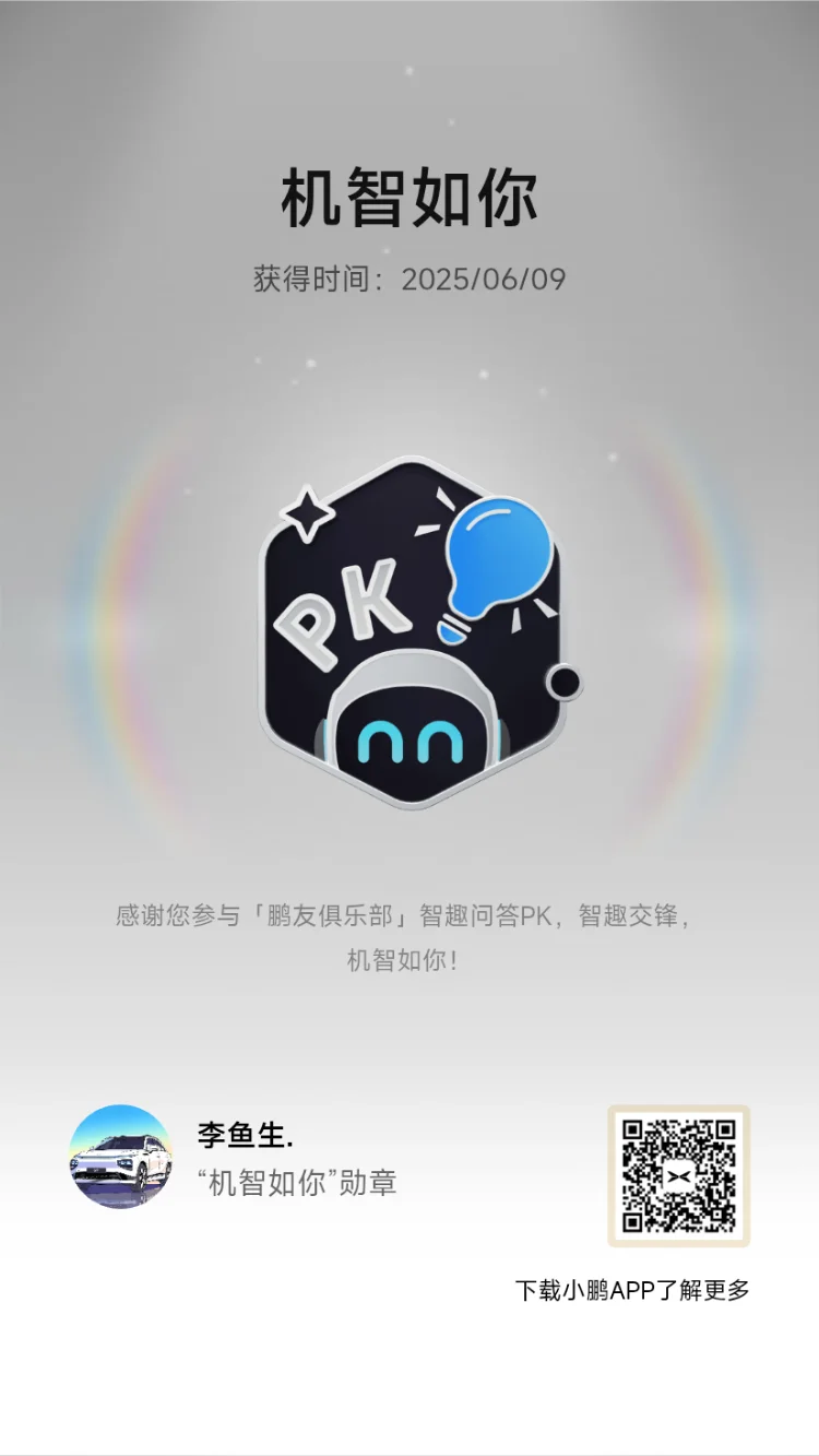 鹏友俱乐部智趣问答PK拿下的勋章!和鹏友们脑力交锋、趣味答题,既能涨知识又能赢荣誉,妥妥的智趣担当,这枚勋章必须珍藏~