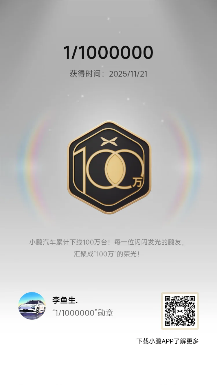 超有纪念意义的一枚!小鹏汽车累计下线100万台,很荣幸成为这百万分之一,和所有鹏友一起见证品牌荣光,这枚勋章是属于全体鹏友的骄傲🌟