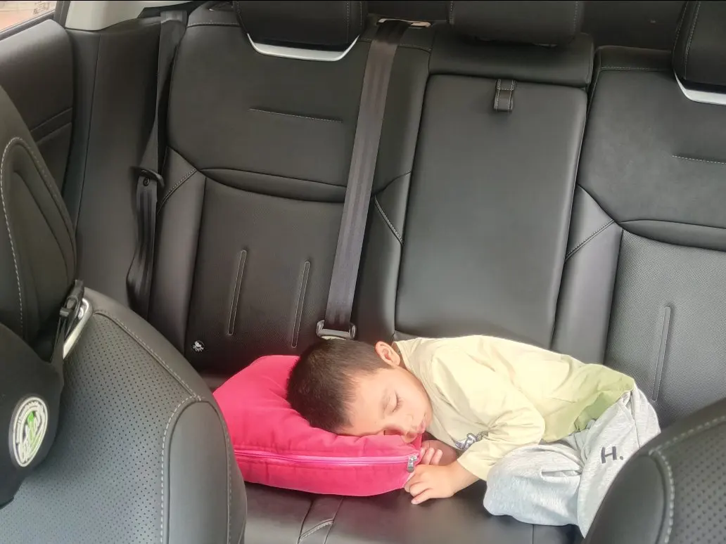 车行途中,后座的小不点枕着粉枕酣然入睡。呼吸轻缓,眉头舒展,这方车内的小小天地,盛满静谧与温柔,是奔波路上最治愈的风景。