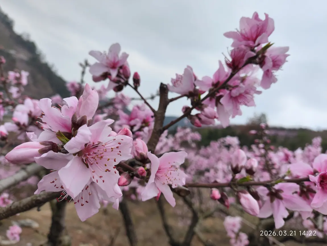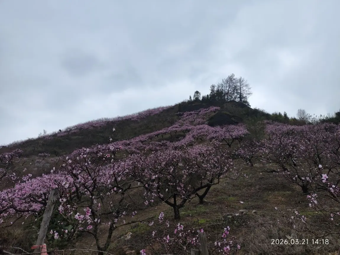 周末的天蒙着一层浅灰,却挡不住我们寻春的脚步。沿着石阶往山上走,风里渐渐裹着甜香,转过一个缓坡时,漫山的桃花猝不及防撞进眼里——粉云似的花团缀在虬劲的枝桠上,把整座山都晕成了温柔的胭脂色。