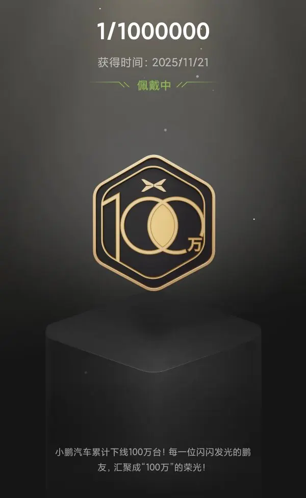 #晒晒我的勋章# 小鹏获得的勋章🎖️,最珍惜就是这个100万之一了,共同创造了奇迹,一起为小鹏努力吧!