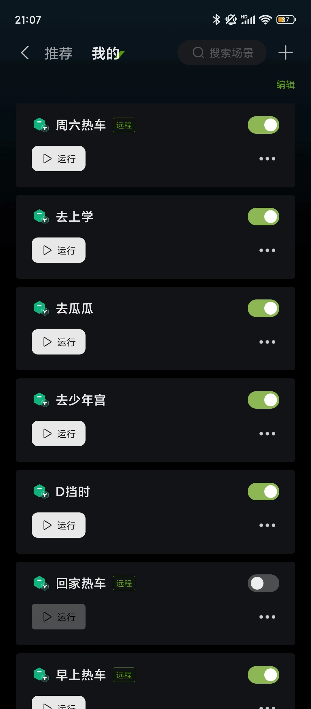 #玩转智慧场景# 5个常用地址,直呼名字,直达导航,早晨热车,回家热车,周六热车。非常方便,每天坐车热乎乎的,挂上d档,打开前摄像头,特别方便,再去上学,去公司特别顺畅,夏天到了,我要弄一个。定时空调的场景,特别凉快。总之特别方便