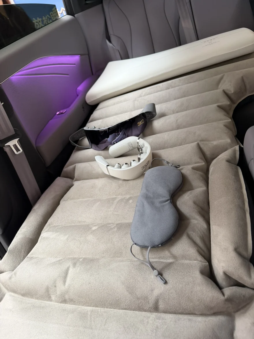 一键打开【小憩模式】🌙,座椅缓缓放平,零重力姿态简直像飘在云上☁️!配合SKG睡眠套装,戴上眼罩、枕着专属颈枕,车内静谧性绝了🔇,外界喧嚣瞬间隔绝~智能座舱自动调节恒温空调🌡️,暖意包裹全身,这不就是移动的“深睡舱”嘛😴💤!
