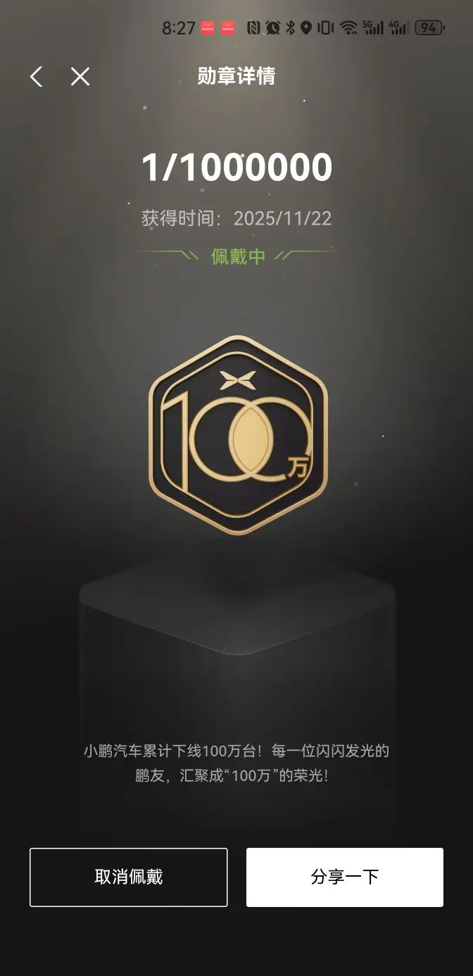 这是我最近最骄傲的一个——小鹏汽车累计下线100万台纪念徽章!编号是1/1000000,2025年11月22日获得的,现在正戴着它呢~设计超有质感,金色和黑色搭配,六边形轮廓里“100万”的数字科技感十足,“0”中间还融入了小鹏标志,超酷!它代表着小鹏的里程碑,也让我感觉自己是这百万荣光的一部分,必须天天佩戴!