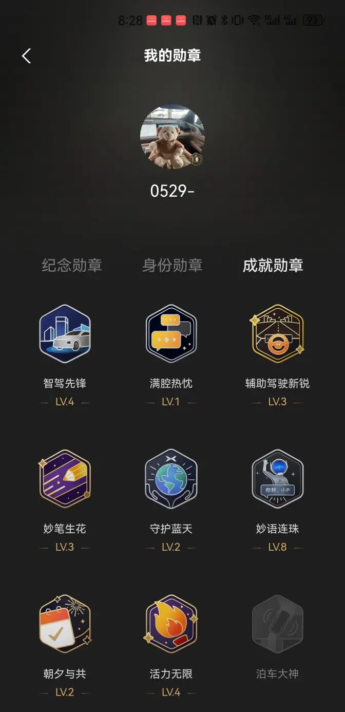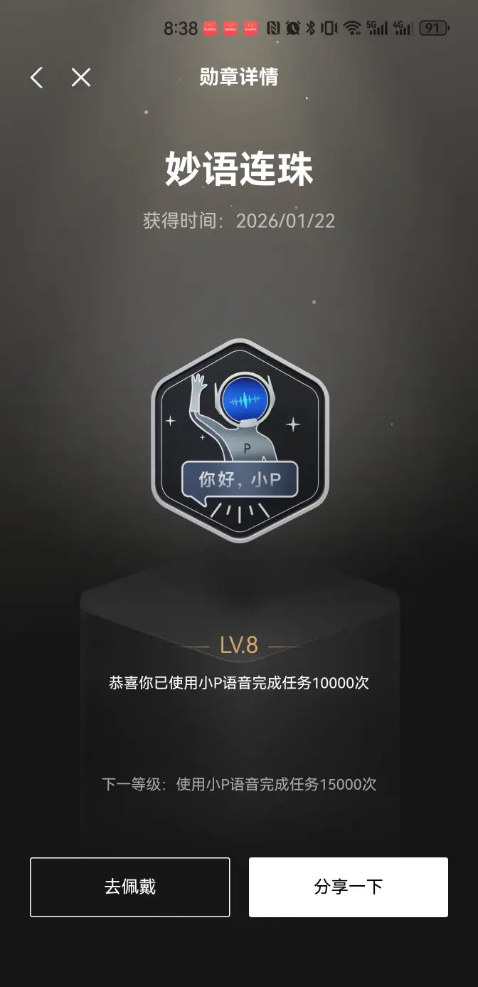 - 妙语连珠徽章:今年1月22日新鲜解锁!是我的语音小助理“小P”的专属勋章~已经用它完成了10000次语音任务,等级高达LV.8!徽章是可爱的机器人形象,对话框里写着“你好,小P”,每次看到都觉得超亲切,是我和爱车深度“交流”的见证!