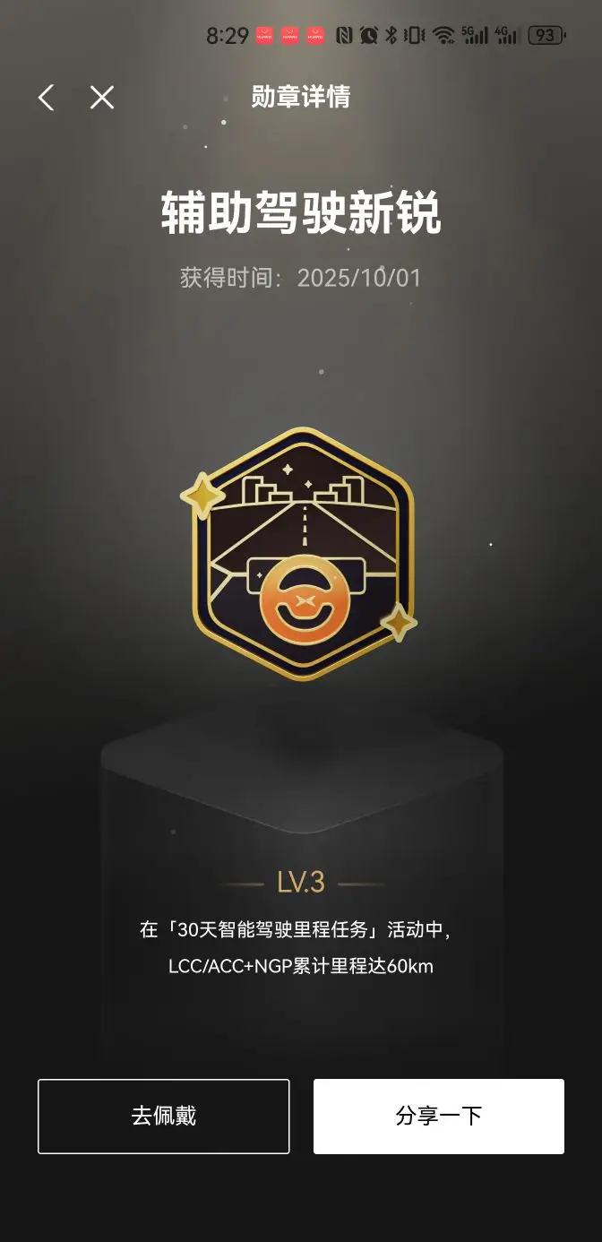 - 辅助驾驶新锐徽章:2025年10月1日获得,在30天智能驾驶任务里累计跑了60km LCC/ACC+NGP~设计超科幻,金色外框配黑色底色,还有星星和方向盘图案,科技感拉满!