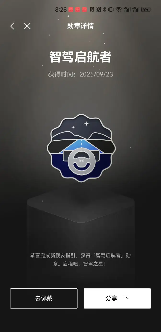 - 智驾启航者徽章:2025年9月23日拿到,完成新鹏友指引就送了!深蓝色背景像夜空,星星和道路图案超有氛围,寓意我的智驾之旅正式启航,超有纪念意义!