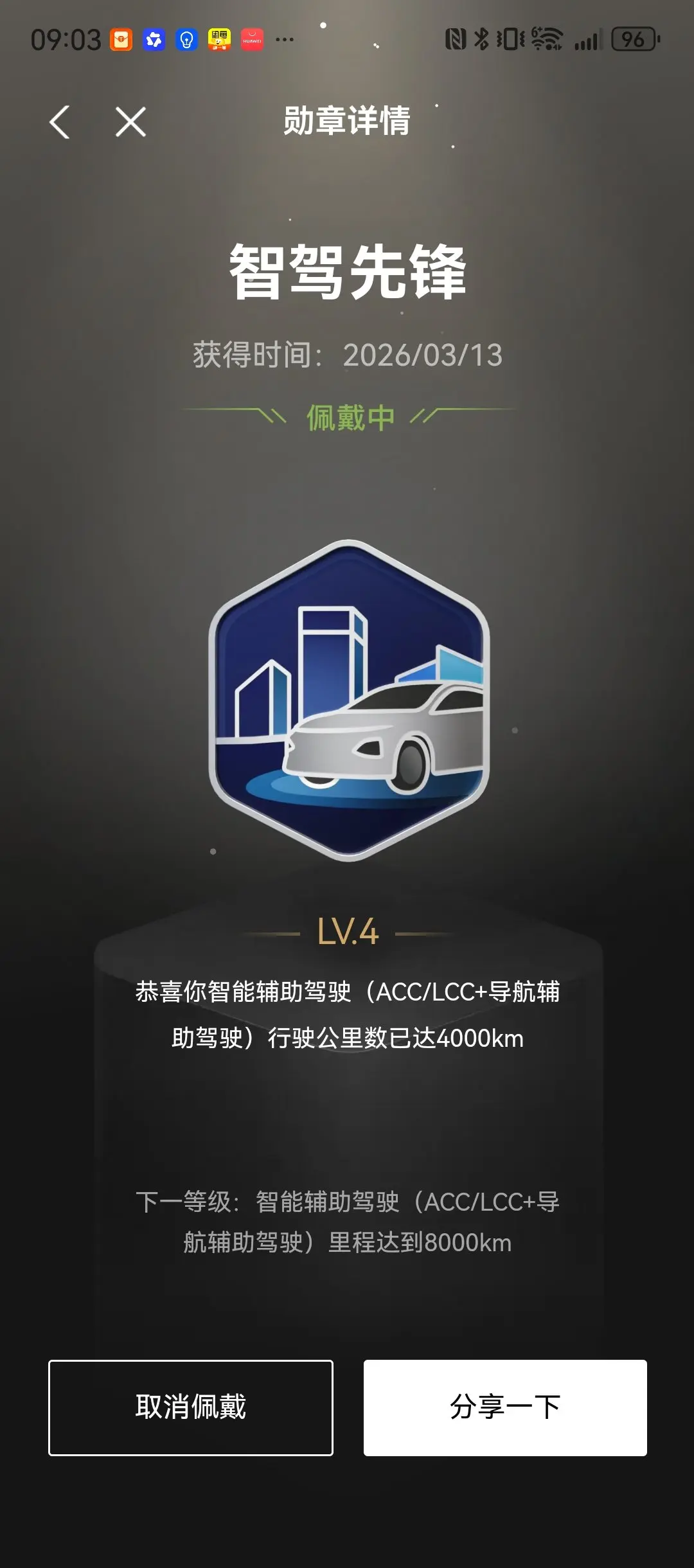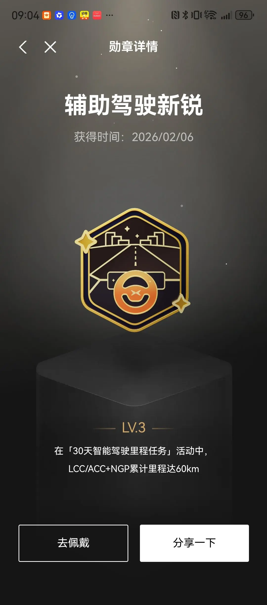 目前佩戴的是智驾先锋LV.4勋章,这是我用3889km辅助驾驶里程跑出来的荣誉,覆盖了18座城市,见证了我对小鹏智驾的信任。从最初的「智驾启航者」到现在的「辅助驾驶新锐」,一步步解锁的不仅是勋章,更是对智能出行的底气。