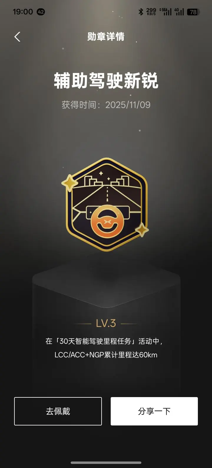 这是我拿到的第一枚勋章,获得于2025/10/24,完成新鹏友指引时解锁的。蓝黑配色的徽章里,星空、公路和方向盘的设计太戳我了——它不仅是新手入门的纪念,更是我第一次体验小鹏智驾的起点,每次看到都能想起刚提车时,对着辅助驾驶功能反复摸索的新鲜感。