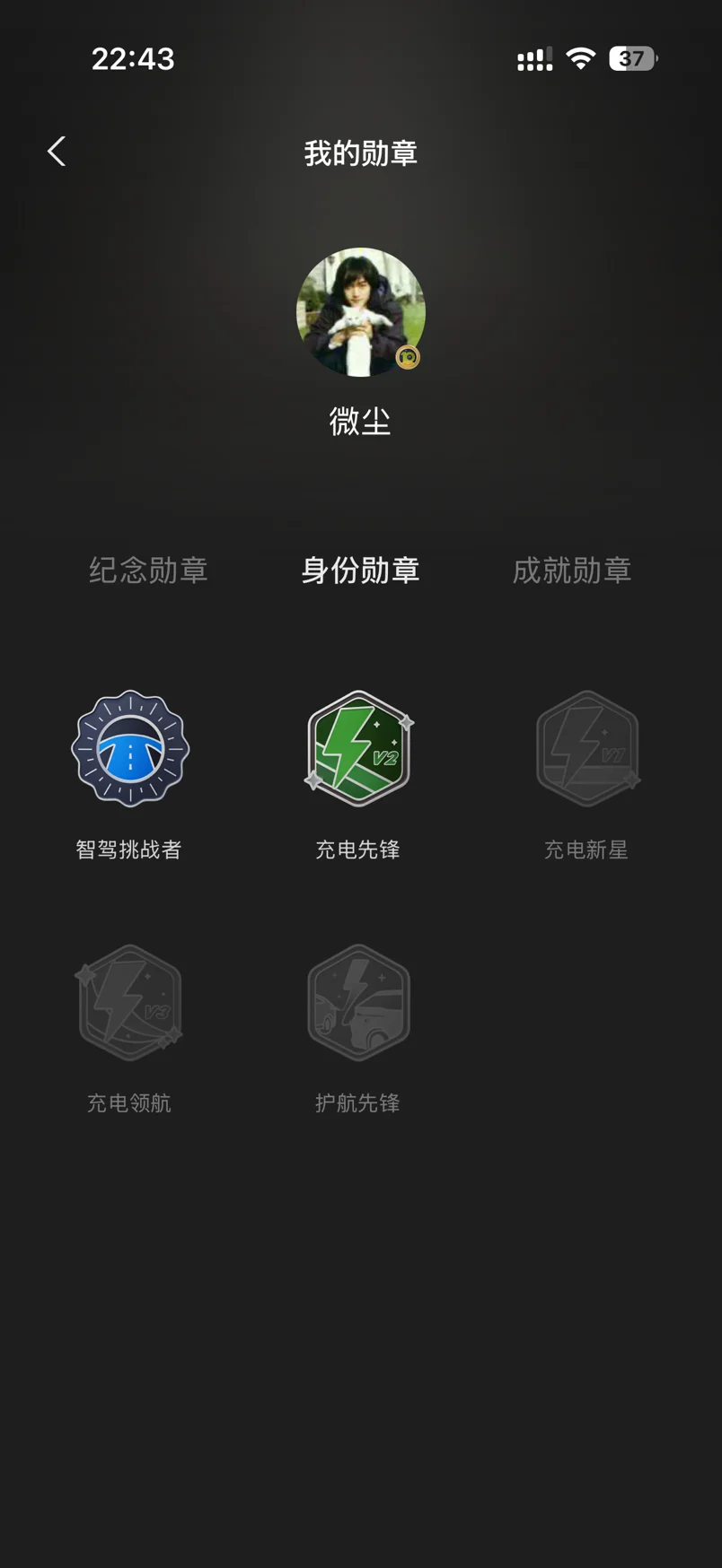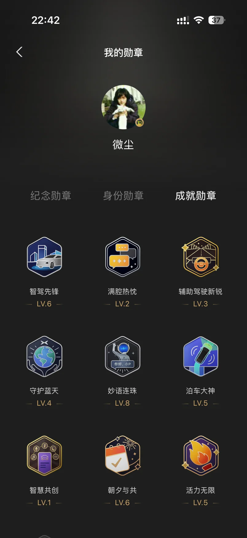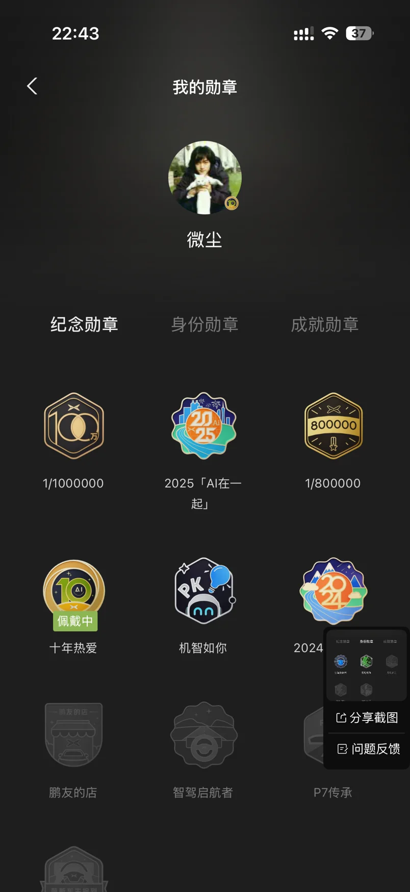 成就勋章更多的是辅助驾驶相关的智能辅助驾驶。目前自己佩戴的应该是 10 周年勋章,这个是 10 周年的时候获得的,10 周年也是和鹏子相遇的第一周年,相信鹏子的技术能力。