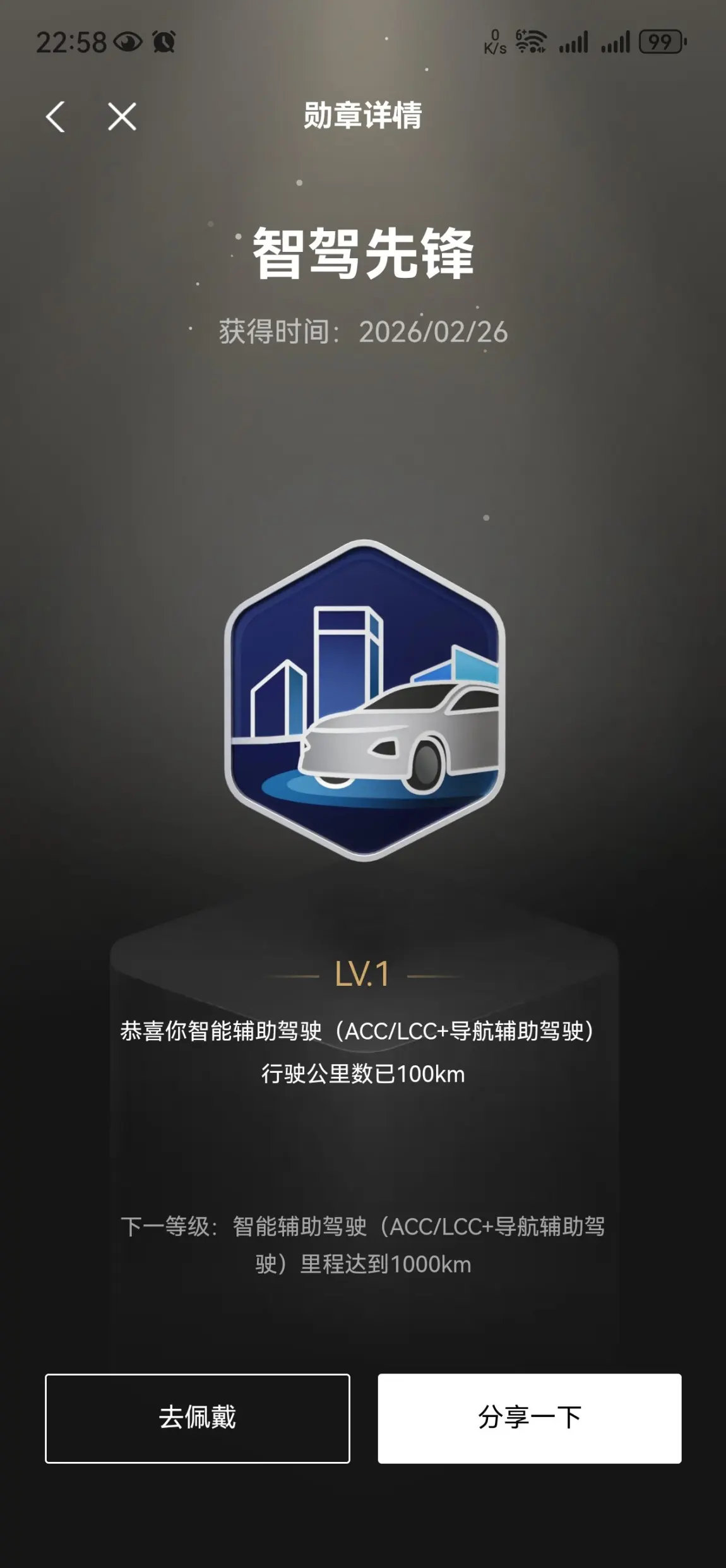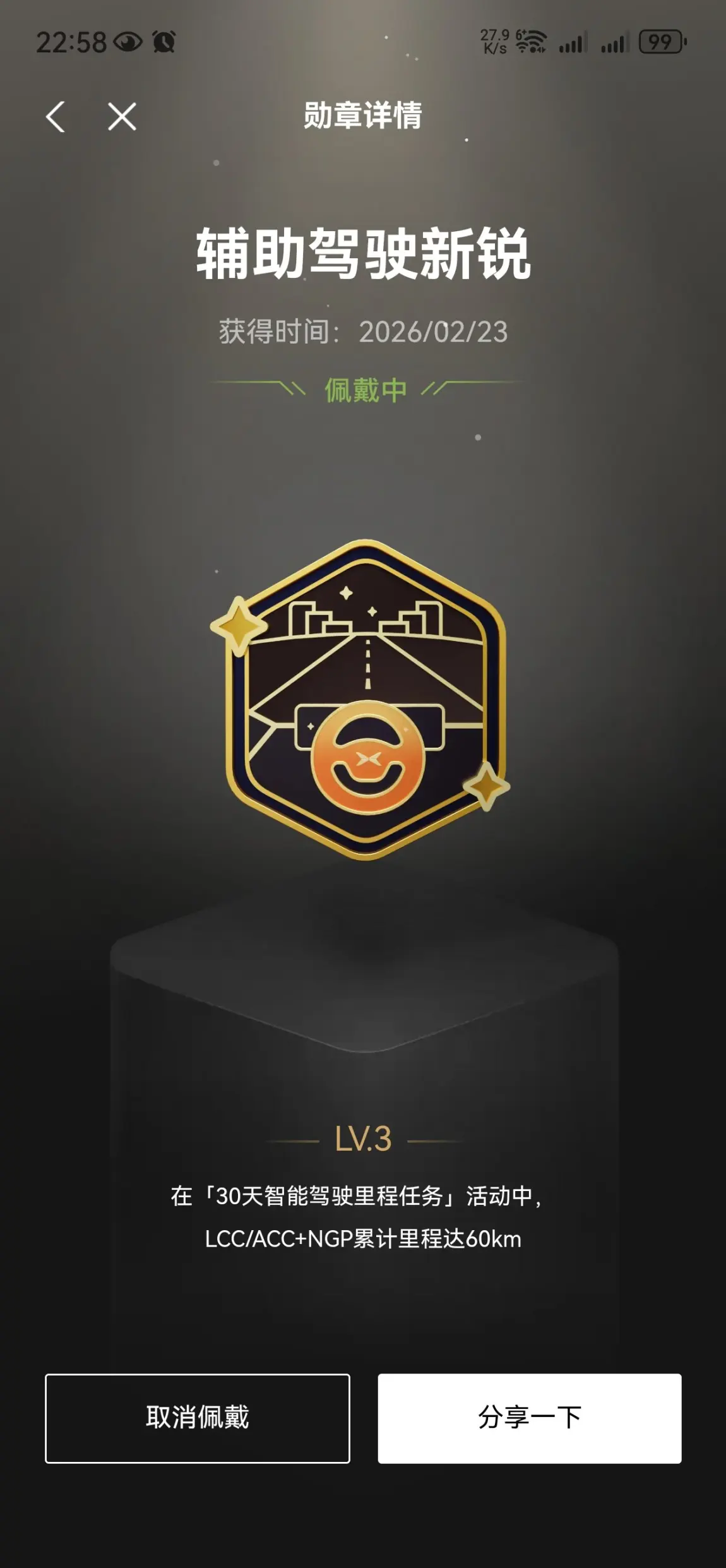 #晒晒我的勋章# 参与小鹏汽车勋章活动这段时间,真的让日常用车多了不少仪式感和乐趣。从提车后的初次上路,到熟练使用ACC、LCC智能驾驶辅助,再到一次次流畅完成辅助泊车,每一个用车场景都被一枚枚勋章认真记录下来。原本普通的通勤、出行,也因为这些小成就变得更有期待感。