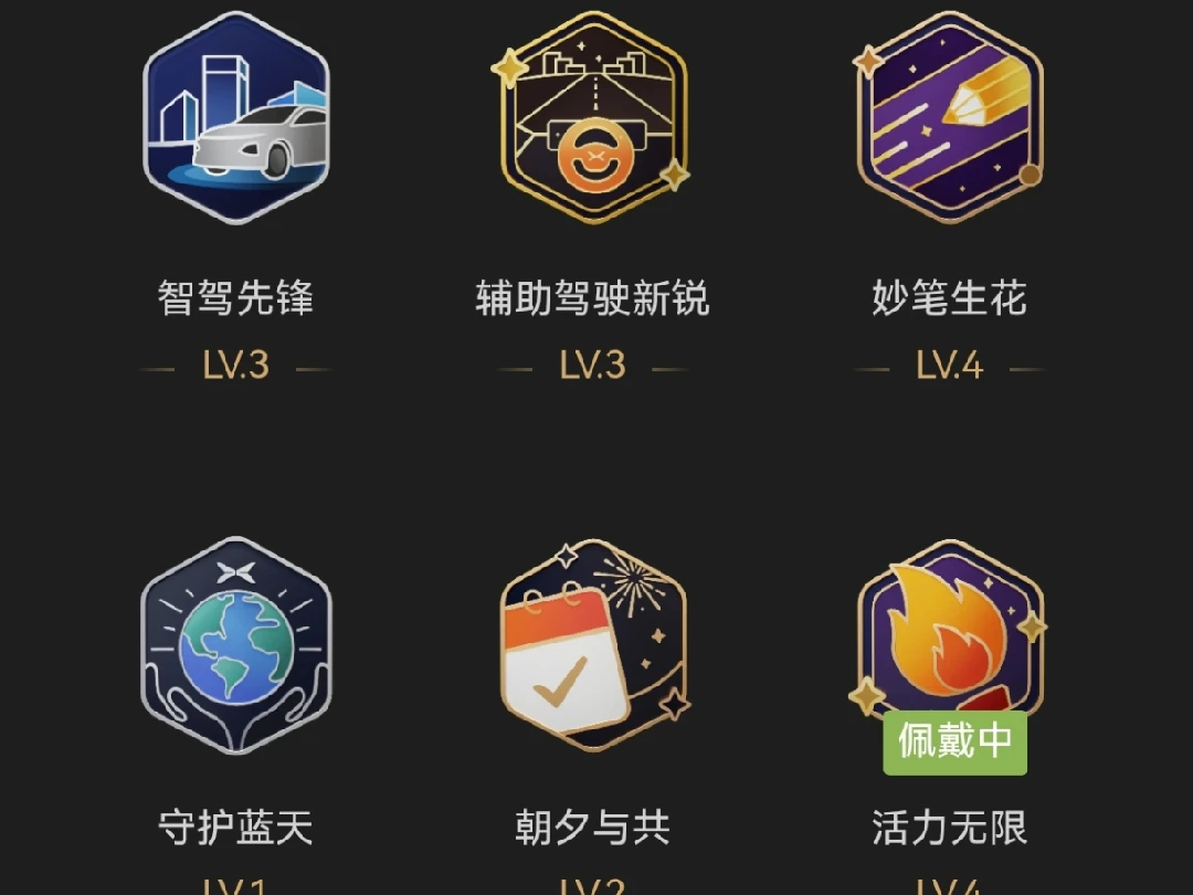 - 「朝夕与共」(LV.2):代表着我与爱车相伴的时长,从提车到现在,每天的通勤、周末的露营,都在为这枚勋章添砖加瓦。