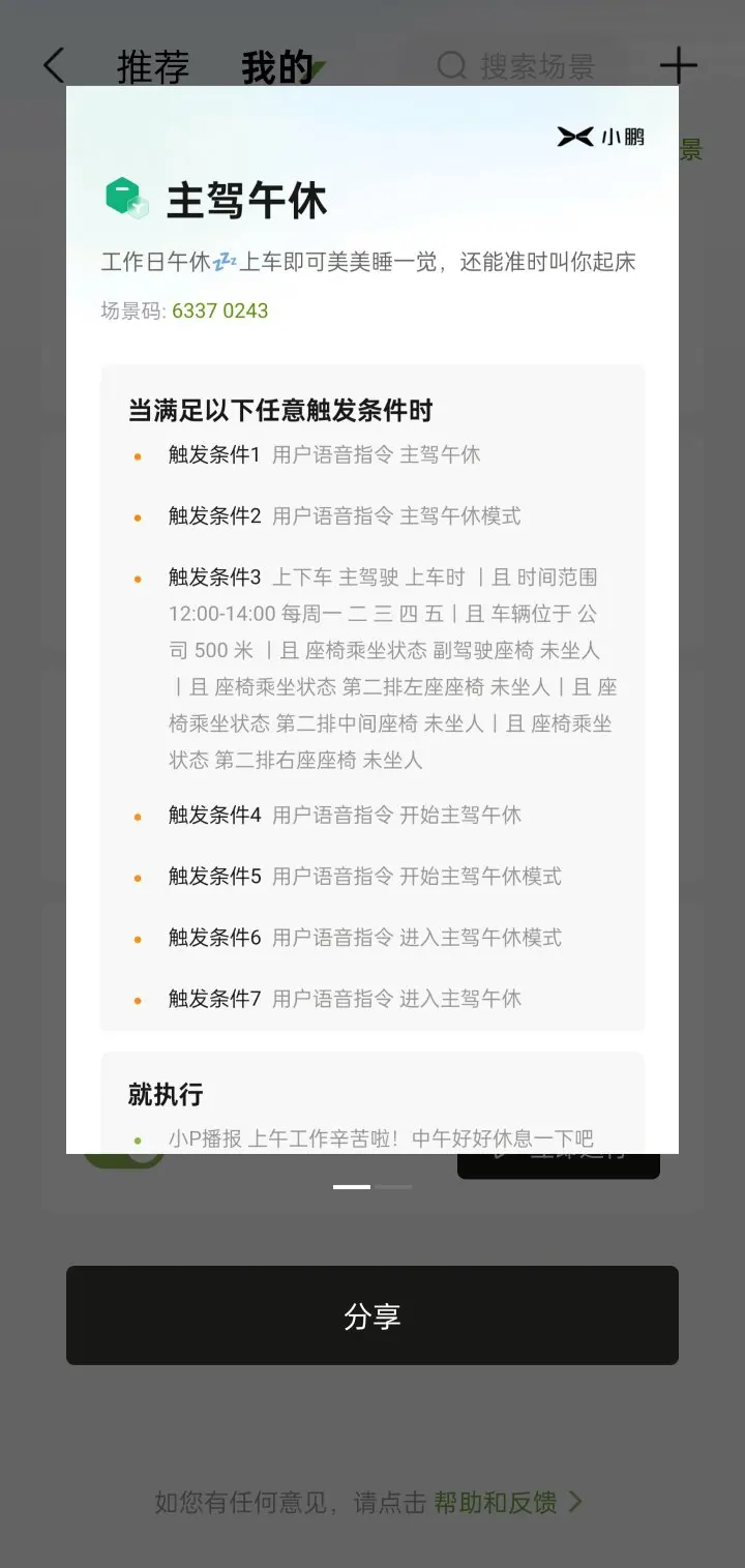 当牛马拉磨一上午,蹭完公司拼好饭,随即坐上小G6让智慧场景进入午休模式,自动调节空调、音乐、座椅(这波要是有腿托将会绝杀,可惜加不得)架上遮光板,盖上薄毯子美美睡个午觉。下午让美好的音乐提醒你起床……再打拼半天就能回家享受家庭生活咯;分享智慧场景给大家,可以花点时间自行调整哦。