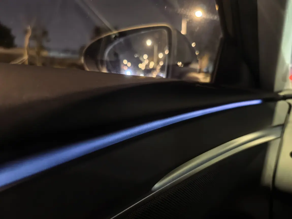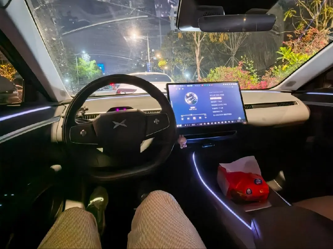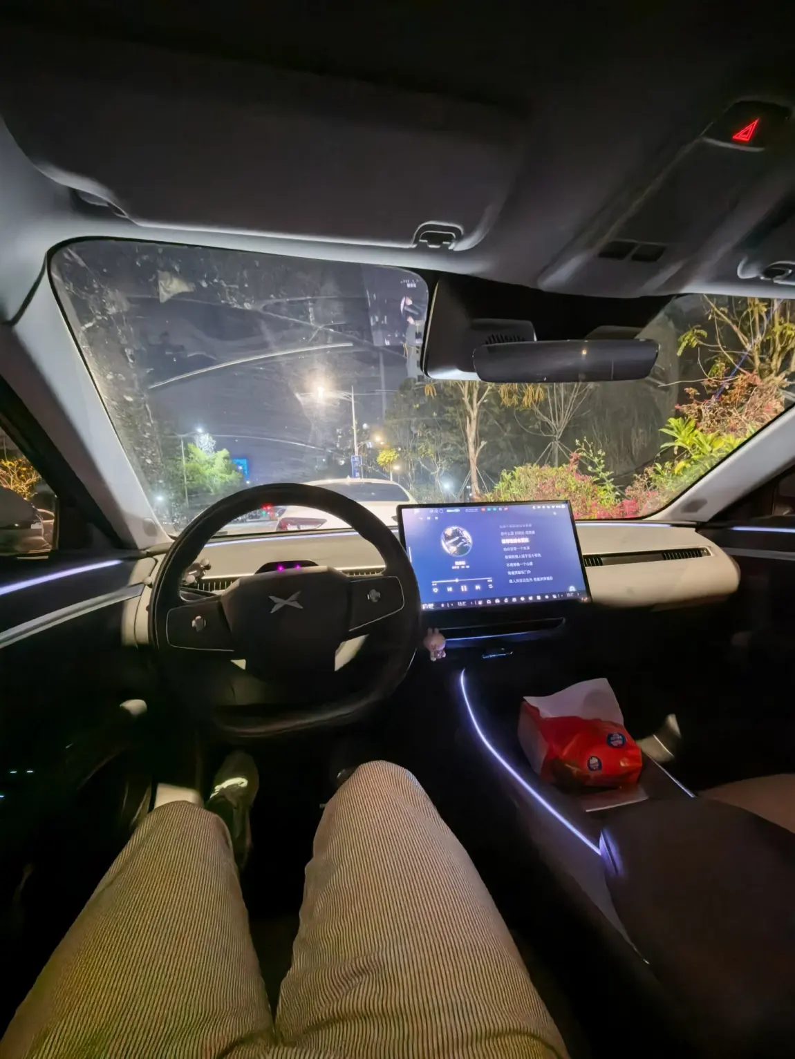 把座椅往后调,靠背放低一点,找到一个半躺的姿势。打开氛围灯,选个喜欢的颜色,光线不刺眼,车里看着舒服很多。