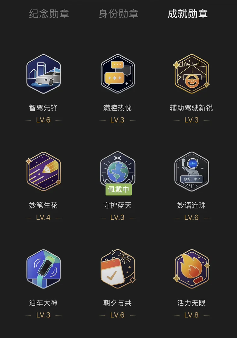 3:成就勋章获得了九枚,每一个勋章都是我过去的成就,记录我在小鹏成长记录,都是满满的回忆。