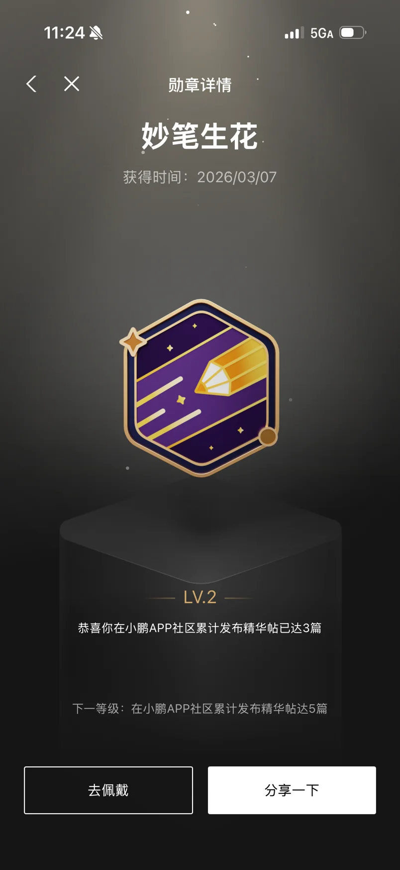 “妙笔生花LV.2”是对我创作的肯定,从提车日记到用车攻略,每一篇笔记都是我和小鹏故事的记录。“朝夕与共LV.3”则是我每日打卡的仪式感,让用车生活充满细碎的小确幸。