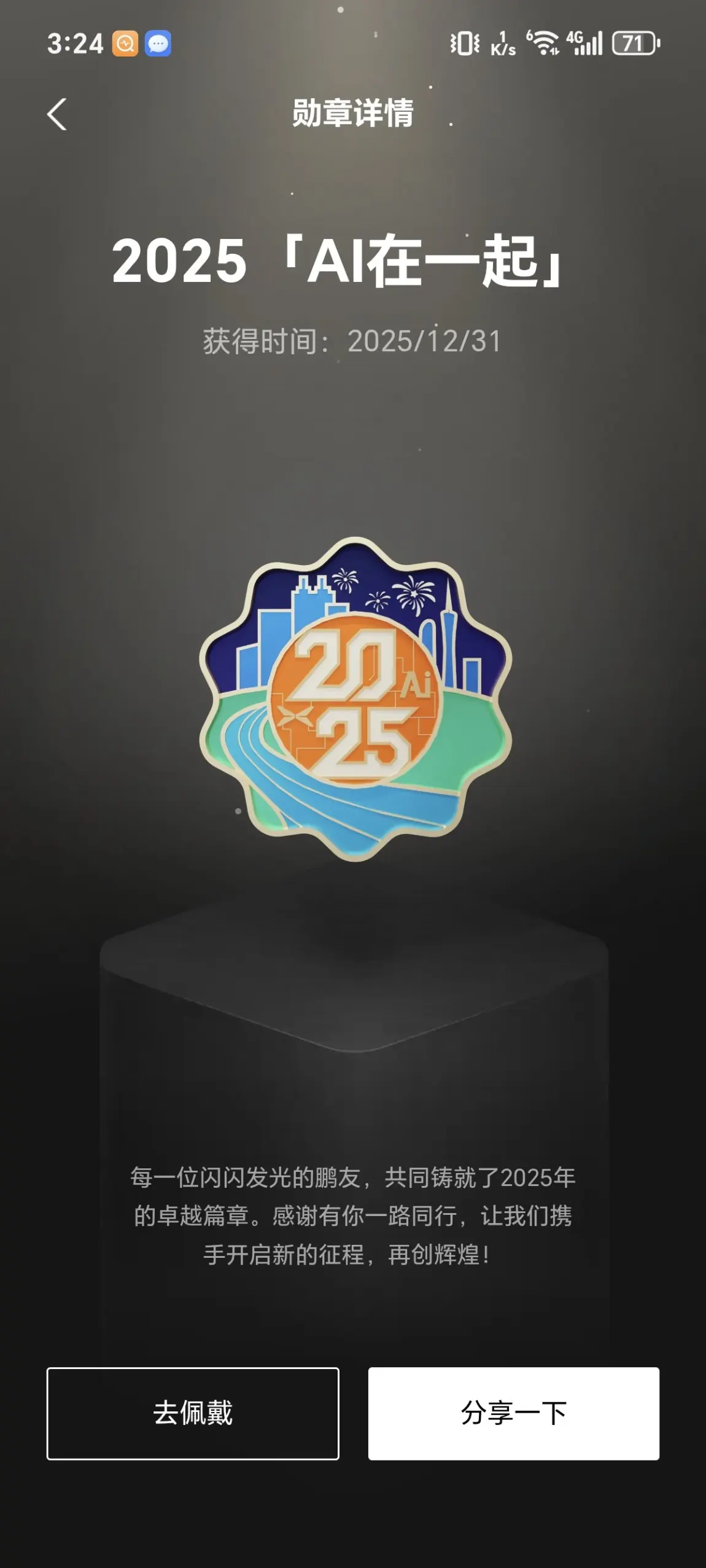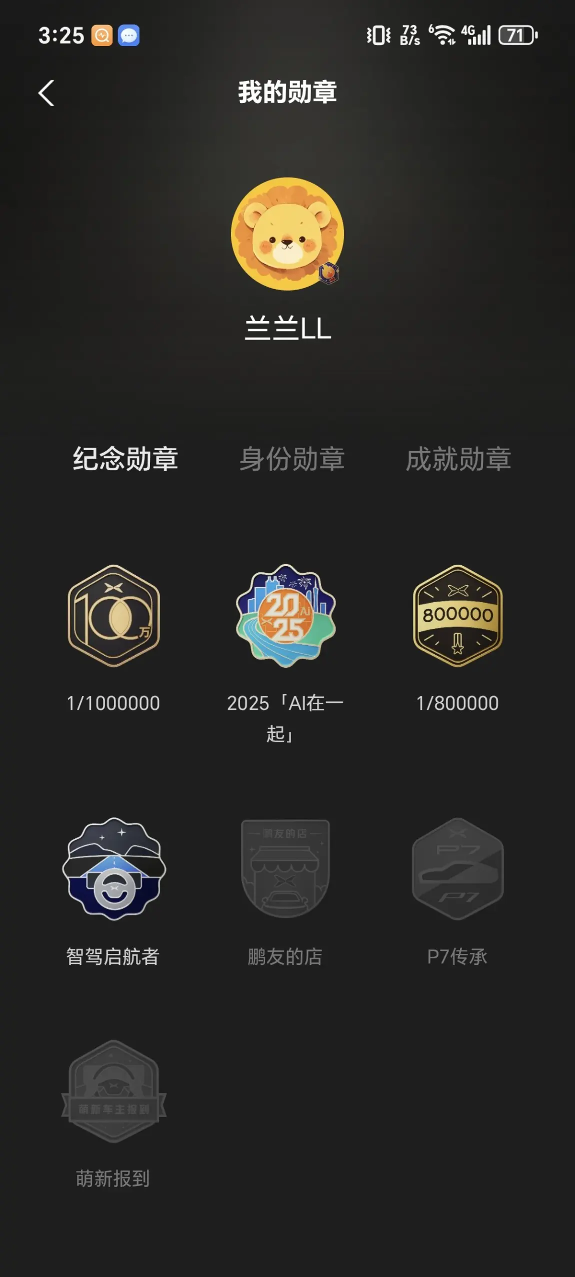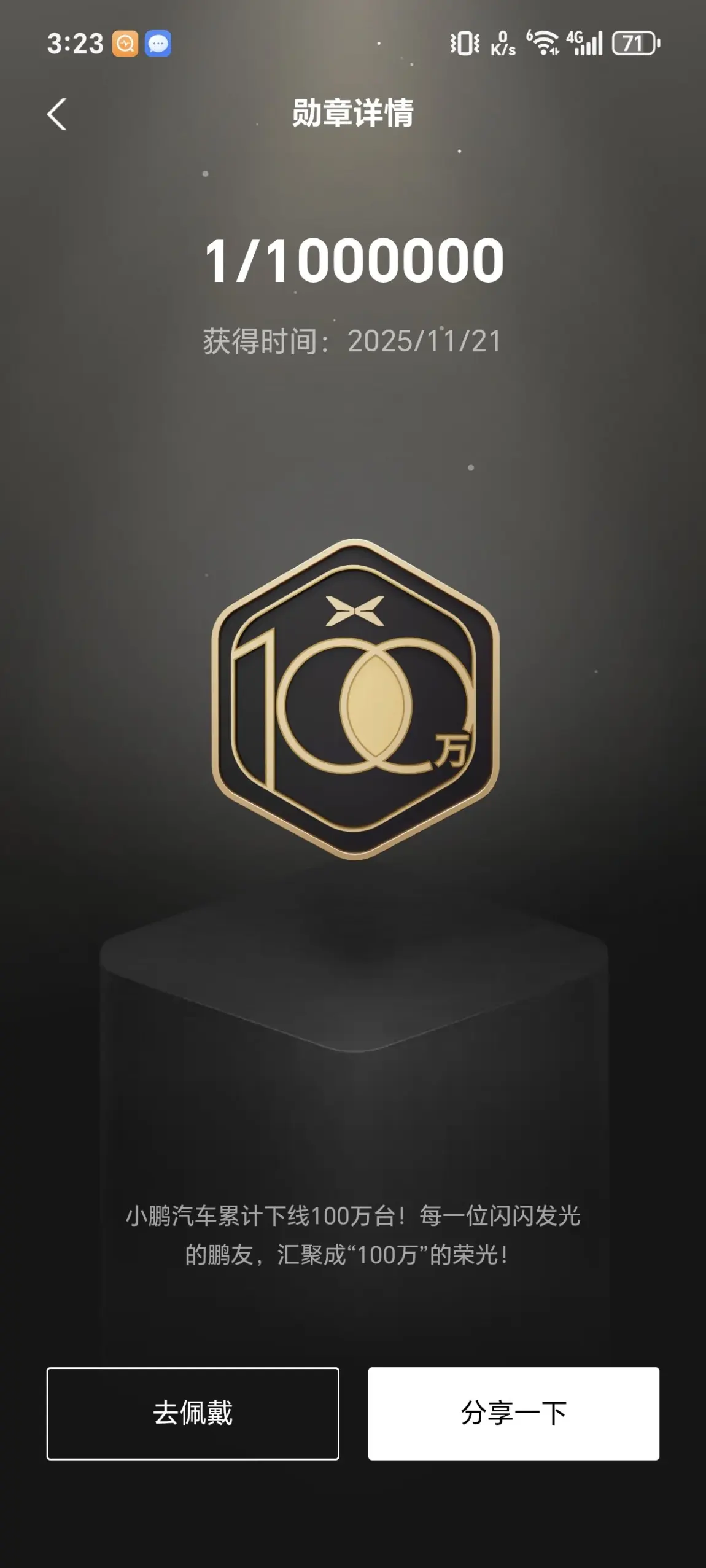 翻遍勋章墙,现在主页一直戴着的,是2025.11.21解锁的小鹏汽车累计下线100万台纪念勋章。