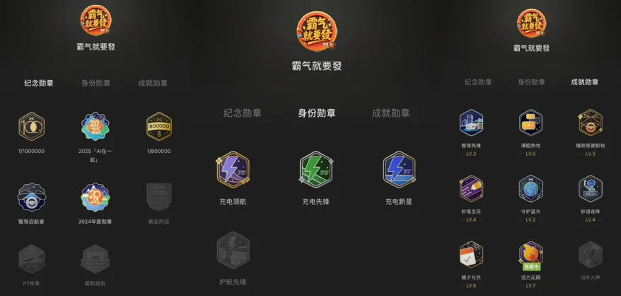 目前我已收集到16枚风格各异、意义独特的勋章。从彰显身份的充电等级勋章,到记录互动与成就的专属徽章,每一枚都像一把钥匙,打开了我在小鹏社区里不同维度的记忆匣子。其中,“100万下线纪念”“活力无限”“充电领航”这三枚带有特殊纪念意义的勋章,更是串联起了我与品牌、与社群的温暖羁绊。
