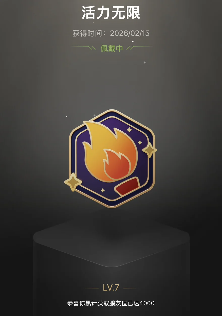 目前我的勋章库中,若要问我最青睐哪枚,“活力无限”当仁不让。它记录了我在社区持续输出的热情——从分享智驾体验、参与话题讨论到发布用车故事,每一次互动都让“活力值”累计,最终在2026年2月15日解锁LV.7。看着勋章上跃动的火焰,就像看到自己在小鹏社群里从未熄灭的热爱,它是我活跃足迹的生动注脚。选择它的理由很简单:它代表了我在小鹏社区的“生命力”——从最初的小白车主,到逐渐熟悉智驾功能、爱上分享用车点滴,是每一次点击“发布”、每一条真诚评论,让这枚勋章从LV.1成长为LV.7。它不仅是等级的象征,更是我与小鹏社群情感连接的见证,每次点亮它,都能回想起那些为分享经验熬夜写文案、为解答车友疑问耐心沟通的时刻。