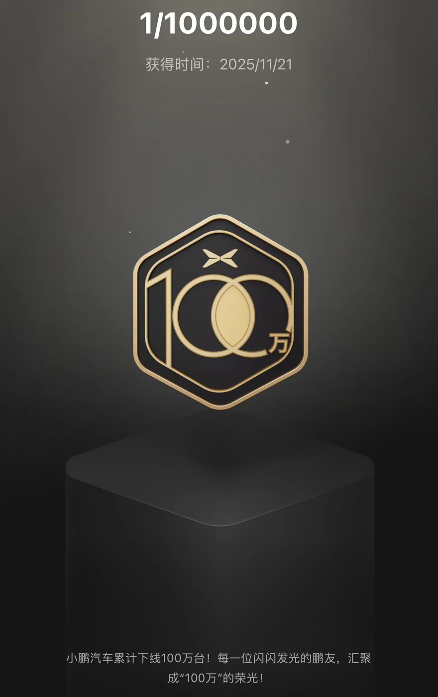 2025年11月21日,我收到了“100万下线纪念”勋章。那天,小鹏汽车累计下线第100万台车的消息刷屏社群,这枚1/1000000的勋章,是百万车主共同托起的荣光。我记得打开勋章界面时,看到“每一位闪闪发光的鹏友,汇聚成‘100万’的荣光”的文案,瞬间泪目。作为最早一批MONA小鹏车主,见证了品牌从“新势力”到“百万俱乐部”的跨越,这枚勋章像一枚时光胶囊,装着我对小鹏从信任到深爱的历程,也装着百万用户共同的坚持与热爱。