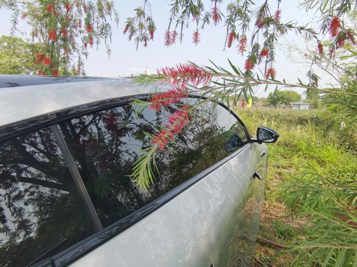 抵达景区后,特意把车停在两棵红千层树中间,斑驳的树荫刚好遮住车身,既避免了阳光直晒,又和周围的绿意融为一体,银灰色的车身在花树映衬下,多了几分温柔的质感。
