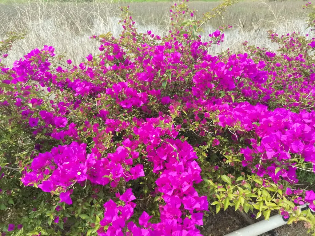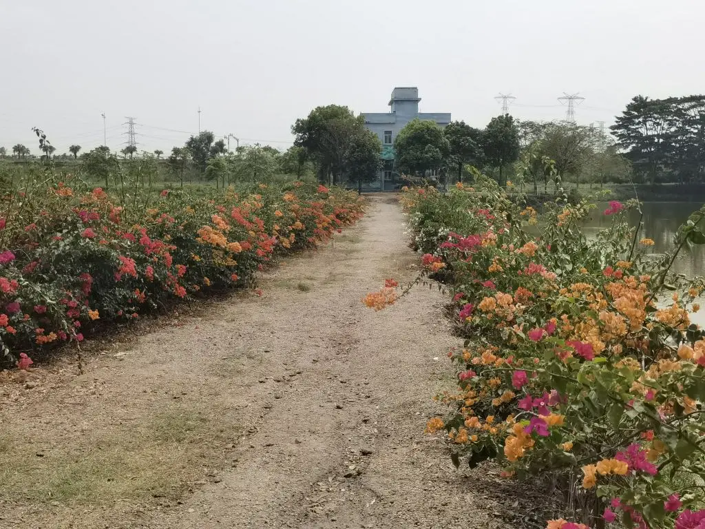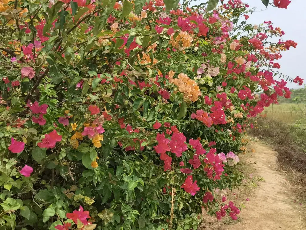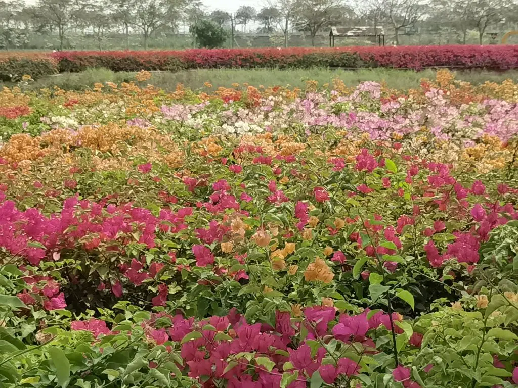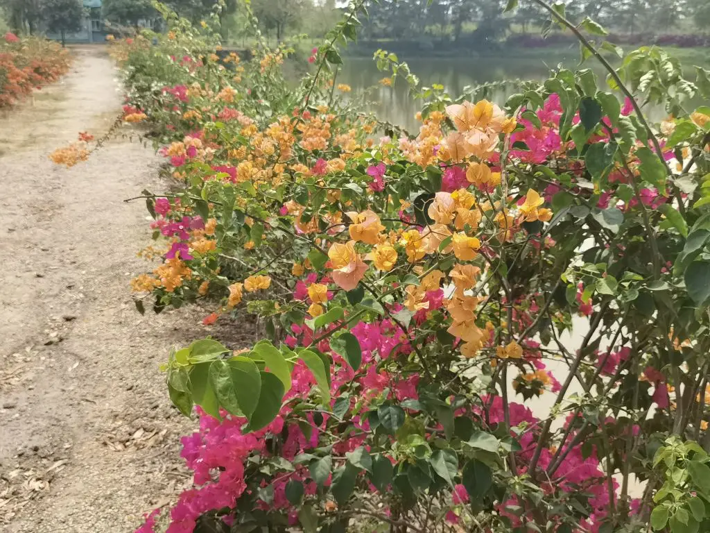 2、三角梅——接着是三角梅长廊,玫红、橙黄、浅粉的三角梅爬满了围栏,层层叠叠的苞片像燃烧的火焰,把整条路都染成了浪漫的颜色。阳光透过花叶洒下来,在地上投下细碎的光斑,随手一拍都是氛围感满满的大片,连风里都带着热烈的气息。