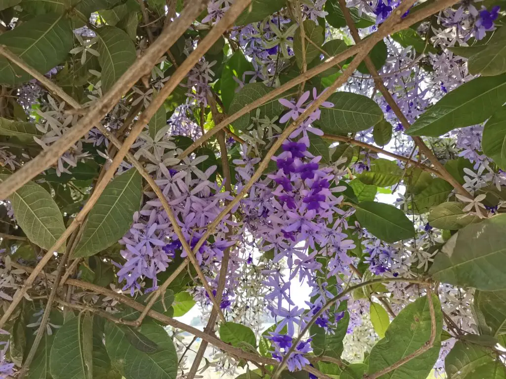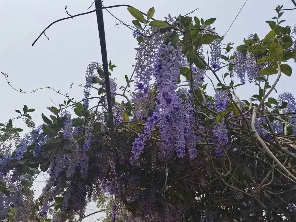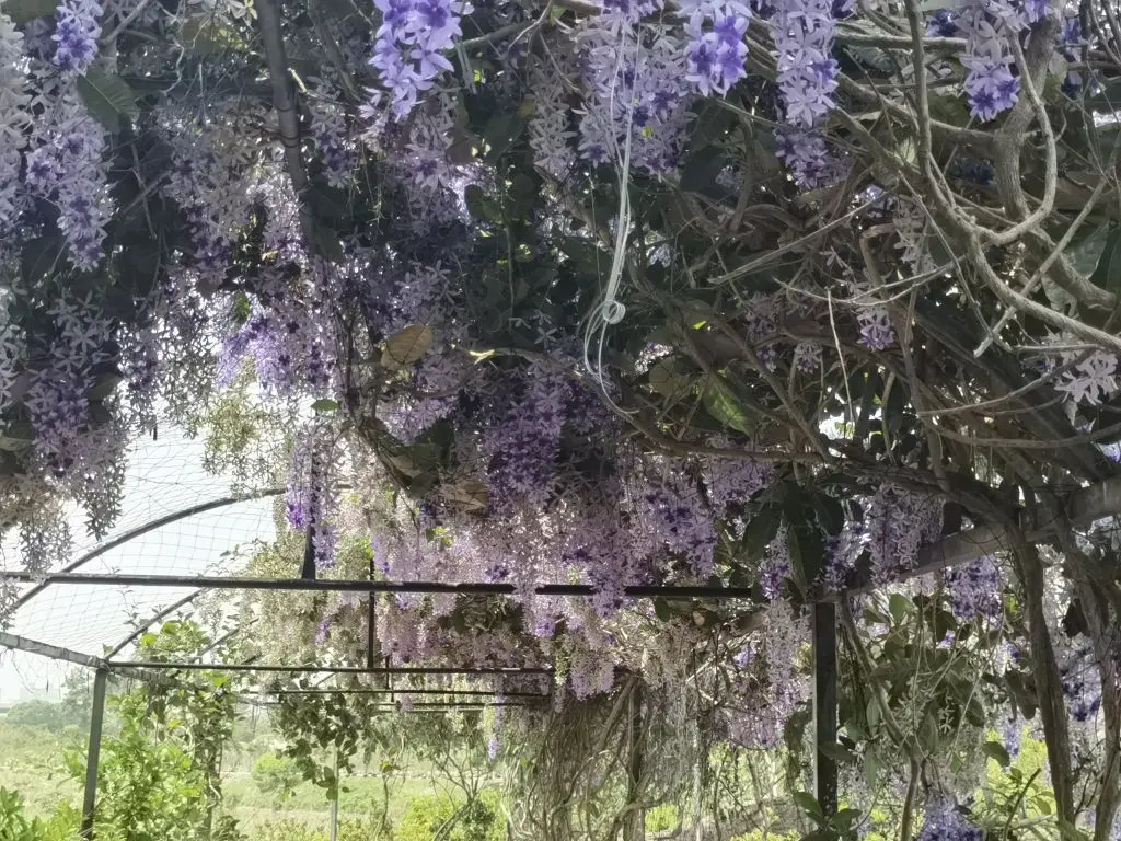 3、蓝花藤——穿过三角梅长廊,一串串淡紫色的蓝花藤垂落下来,像精致的紫色风铃,在微风里轻轻晃动,细碎的花瓣落在肩头,温柔得不像话。和之前见过的热烈花海不同,蓝花藤多了几分清雅,让人忍不住放慢脚步,静静感受这份春日的静谧。