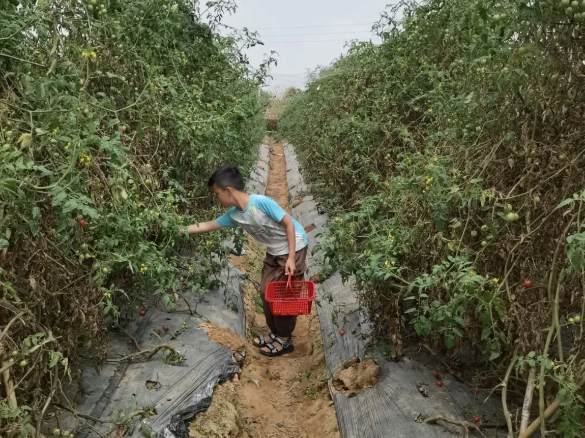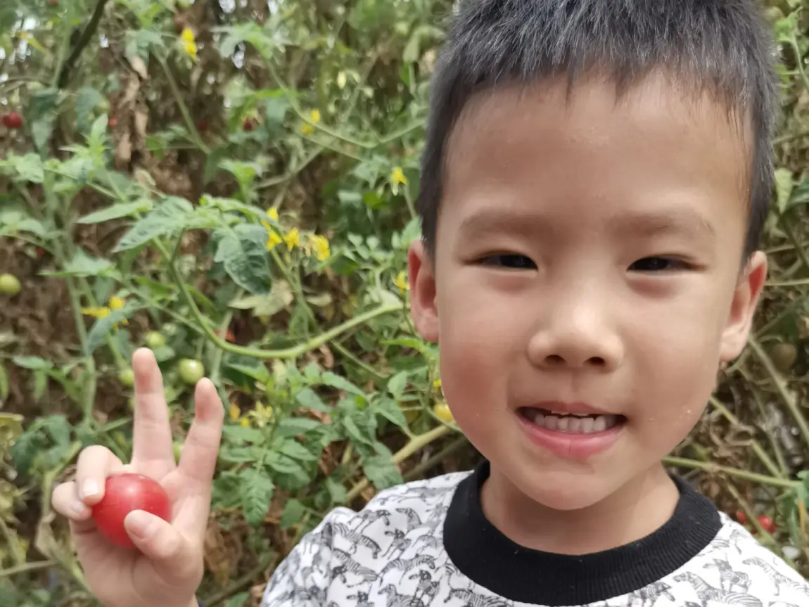 孩子蹲在植株间,认真挑选着最红的番茄,小心翼翼地摘下放进篮子里,脸上满是收获的喜悦。看着他举着小番茄比耶的模样,突然觉得比起逛景区,这种亲手触摸自然、收获果实的体验,更能让孩子感受到春天的温度。