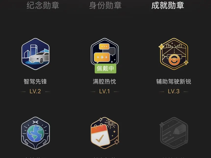 #晒晒我的勋章# 作为小鹏P7+车主,真的太爱小鹏App里的勋章系统啦!提车一个多月已经收集了七枚款勋章,每次看到都能想起提车那天的开心,也算是给爱车的专属纪念~也期待后续能出更多和P7+车型、长途自驾相关的专属勋章,给鹏友们更多收集的快乐!